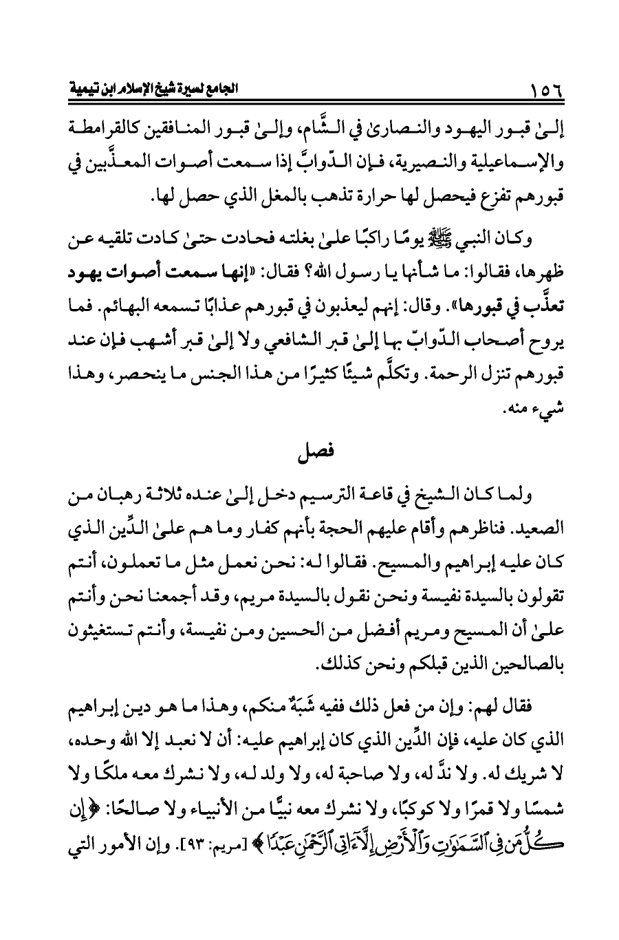 وكان النبي - صلى الله عليه وسلم - يومًا راكبًا على بغلته فحادت حتى كادت تلقيه عن ظهرها، فقالوا: ما شأنها يا رسول الله؟ فقال: «إنها سمعت أصوات يهود تعذَّب في قبورها». وقال: إنهم ليعذبون في قبورهم عذابًا تسمعه البهائم. فما يروح أصحاب الدّوابّ بها إلى قبر الشافعي ولا إلى قبر أشهب فإن عند قبورهم تنزل الرحمة. وتكلَّم شيئًا كثيرًا من هذا الجنس ما ينحصر، وهذا شيء منه.