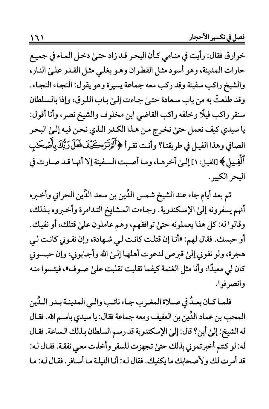 خوارق فقال: رأيت في منامي كأن البحر قد زاد حتى دخل الماء في جميع حارات المدينة، وهو أسود مثل القطران وهو يغلي مثل القدر على النار، والشيخ راكب سفينة وقد ركب معه جماعة يسيرة وهو يقول: النجاء النجاء. وقد طلعتْ به من باب سعادة حتى جاءت إلى باب اللوق، وإذا بالسلطان سنقر راكب فيلًا وخلفه راكب القاضي ابن مخلوف والشيخ نصر، وأنا أقول: يا سيدي كيف نعمل حتى نخرج من هذا الكدر الذي نحن فيه إلى البحر الصافي وهذا الفيل في طريقنا؟ وأنت تقرأ {أَلَمْ تَرَ كَيْفَ فَعَلَ رَبُّكَ بِأَصْحَابِ الْفِيلِ} [الفيل: ١] إلى آخرها، وما أصبت السفينة إلا أنها قد صارت في البحر الكبير.