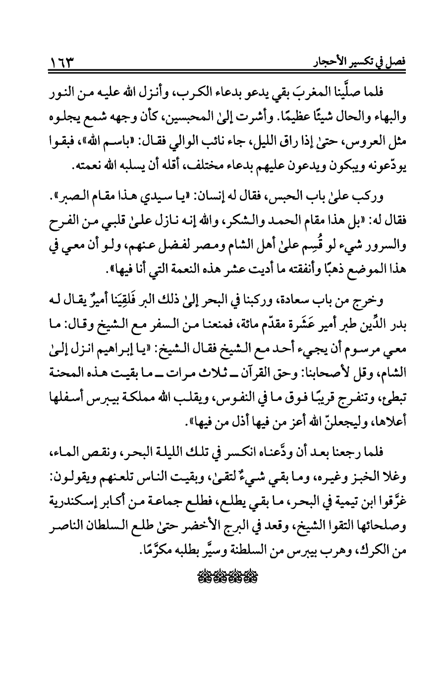 وخرج من باب سعادة، وركبنا في البحر إلى ذلك البر فَلقِيَنا أميرٌ يقال له بدر الدِّين طبر أمير عَشَرة مقدّم مائة، فمنعنا من السفر مع الشيخ وقال: ما معي مرسوم أن يجيء أحد مع الشيخ فقال الشيخ: «يا إبراهيم انزل إلى الشام، وقل لأصحابنا: وحق القرآن ــ ثلاث مرات ــ ما بقيت هذه المحنة تبطئ، وتنفرج قريبًا فوق ما في النفوس، ويقلب الله مملكة بيبرس أسفلها أعلاها، وليجعلنّ الله أعز من فيها أذل من فيها».