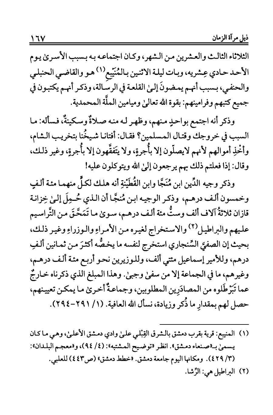 وذكر وجيه الدِّين ابن مُنَجَّا وابن القُطَيْنةِ أنه هلك لكلٍّ منهما مئة ألفٍ وخمسون ألف درهم، وذكر الوجيه ابن مُنجَّا أن الذي حُمِلَ إلى خِزانة قازان ثلاثةُ آلاف ألف وستُّ مئة ألف درهم، سوى ما تَمَحَّقَ من التَّراسيم عليهم والبراطيل (¬٢) والاستخراج لغيره من الأمراءِ والوزراءِ وغير ذلك، بحيث إن الصفيَّ السِّنجاري استخرج لنفسه ما يخصُّه أكثرَ من ثمانين ألفِ درهم، وللأمير إسماعيل مئتي ألف، وللوزيرين نحو أربع مئة ألف درهم، وغيرهم، ما في الجماعة إلا من سفى وجبى. وهذا المبلغ الذي ذكرناه خارجٌ عما تَبَرْطَلوه من المصادَرِين المطلوبين، وجماعةٌ أخرى ما يمكن تعيينهم، حصل لهم بمقدارِ ما ذُكر وزيادة، نسأل الله العافية. (١/ ٢٩١ - ٢٩٤).