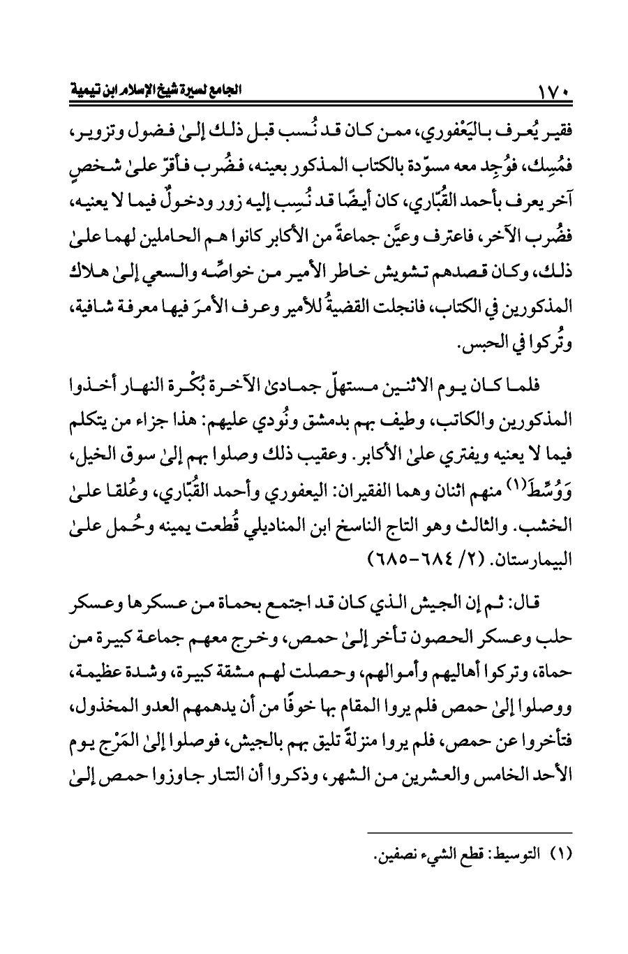 فلما كان يوم الاثنين مستهلّ جمادى الآخرة بُكْرة النهار أخذوا المذكورين والكاتب، وطيف بهم بدمشق ونُودي عليهم: هذا جزاء من يتكلم فيما لا يعنيه ويفتري على الأكابر. وعقيب ذلك وصلوا بهم إلى سوق الخيل، وَوُسِّطَ (¬١) منهم اثنان وهما الفقيران: اليعفوري وأحمد القُبّاري، وعُلقا على الخشب. والثالث وهو التاج الناسخ ابن المناديلي قُطعت يمينه وحُمل على البيمارستان. (٢/ ٦٨٤ - ٦٨٥)