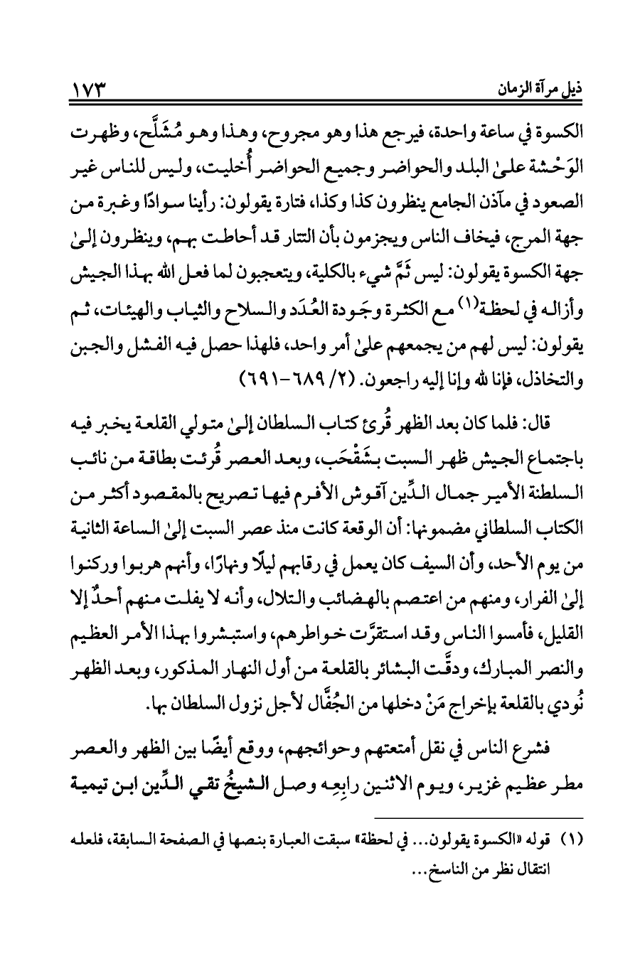 الكسوة في ساعة واحدة، فيرجع هذا وهو مجروح، وهذا وهو مُشَلَّح، وظهرت الوَحْشة على البلد والحواضر وجميع الحواضر أُخليت، وليس للناس غير الصعود في مآذن الجامع ينظرون كذا وكذا، فتارة يقولون: رأينا سوادًا وغبرة من جهة المرج، فيخاف الناس ويجزمون بأن التتار قد أحاطت بهم، وينظرون إلى جهة الكسوة يقولون: ليس ثَمَّ شيء بالكلية، ويتعجبون لما فعل الله بهذا الجيش وأزاله في لحظة (¬١) مع الكثرة وجَودة العُدَد والسلاح والثياب والهيئات، ثم يقولون: ليس لهم من يجمعهم على أمر واحد، فلهذا حصل فيه الفشل والجبن والتخاذل، فإنا لله وإنا إليه راجعون. (٢/ ٦٨٩ - ٦٩١)