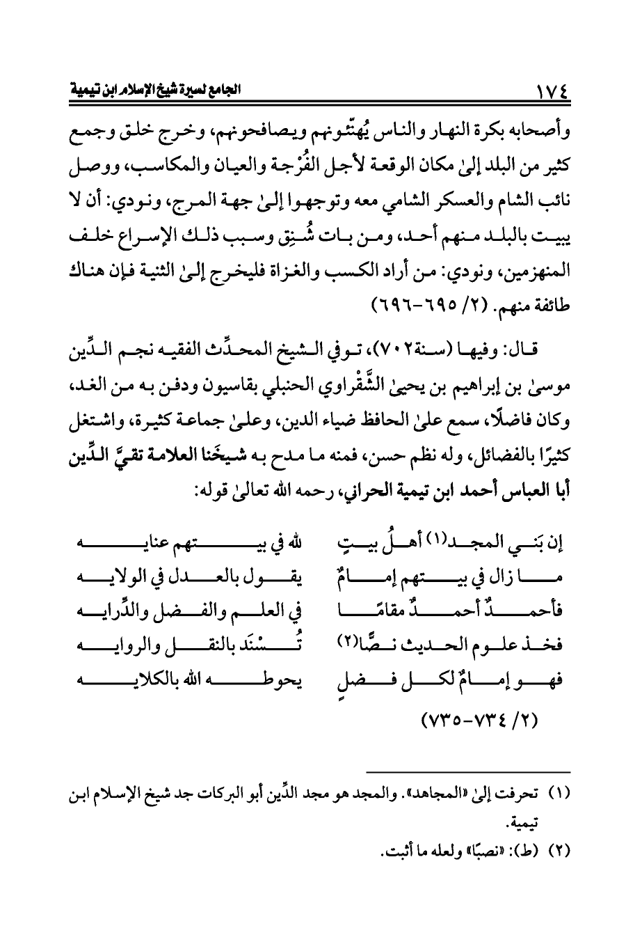 (¬١) تحرفت إلى «المجاهد». والمجد هو مجد الدِّين أبو البركات جد شيخ الإسلام ابن تيمية.