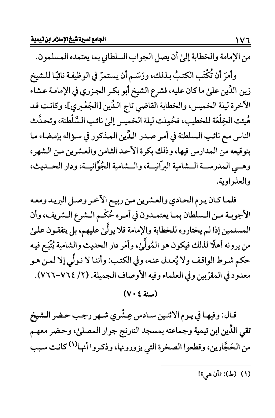 فلما كان يوم الحادي والعشرين من ربيع الآخر وصل البريد ومعه الأجوبة من السلطان بما يعتمدون في أمره حُكْم الشرع الشريف، وأن المسلمين إذا لم يختاروه للخطابة والإمامة فلا يولَّى عليهم، بل يتفقون على من يرونه أهلًا لذلك فيكون هو المُولَّى، وأمْر دار الحديث والشامية يُتْبَع فيه حكم شرط الواقف ولا يُعدل عنه، وفي الكتب: وأننا لا نولِّي إلا لمن هو معدود في المقرّبين وفي العلماء وفيه الأوصاف الجميلة. (٢/ ٧٦٤ - ٧٦٦).