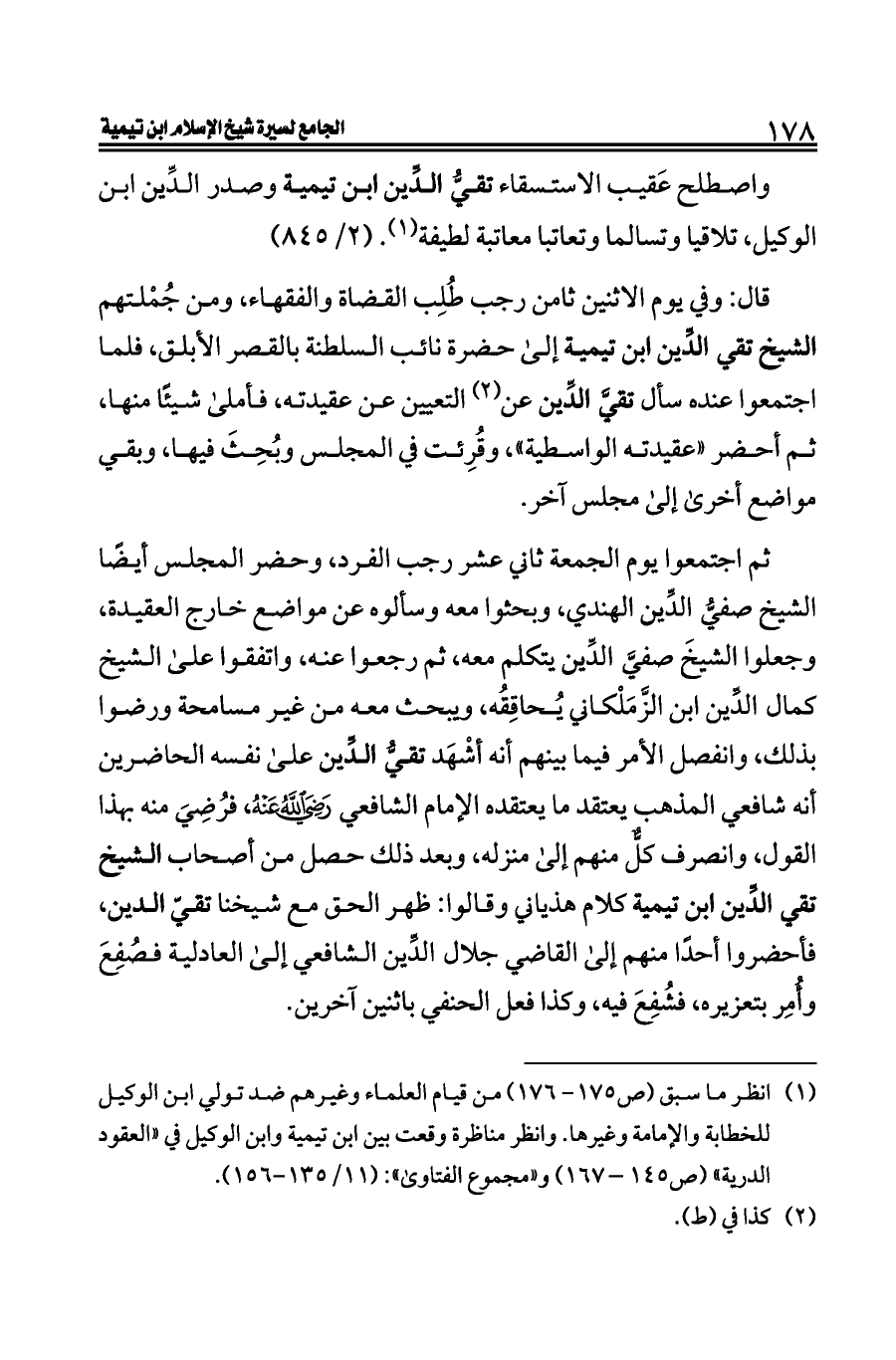 ثم اجتمعوا يوم الجمعة ثاني عشر رجب الفرد، وحضر المجلس أيضًا الشيخ صفيُّ الدِّين الهندي، وبحثوا معه وسألوه عن مواضع خارج العقيدة، وجعلوا الشيخَ صفيَّ الدِّين يتكلم معه، ثم رجعوا عنه، واتفقوا على الشيخ كمال الدِّين ابن الزَّمَلْكاني يُحاقِقُه، ويبحث معه من غير مسامحة ورضوا بذلك، وانفصل الأمر فيما بينهم أنه أشْهَد تقيُّ الدِّين على نفسه الحاضرين أنه شافعي المذهب يعتقد ما يعتقده الإمام الشافعي - رضي الله عنه -، فرُضِيَ منه بهذا القول، وانصرف كلٌّ منهم إلى منزله، وبعد ذلك حصل من أصحاب الشيخ تقي الدِّين ابن تيمية كلام هذياني وقالوا: ظهر الحق مع شيخنا تقيّ الدين، فأحضروا أحدًا منهم إلى القاضي جلال الدِّين الشافعي إلى العادلية فصُفِعَ وأُمِر بتعزيره، فشُفِعَ فيه، وكذا فعل الحنفي باثنين آخرين.