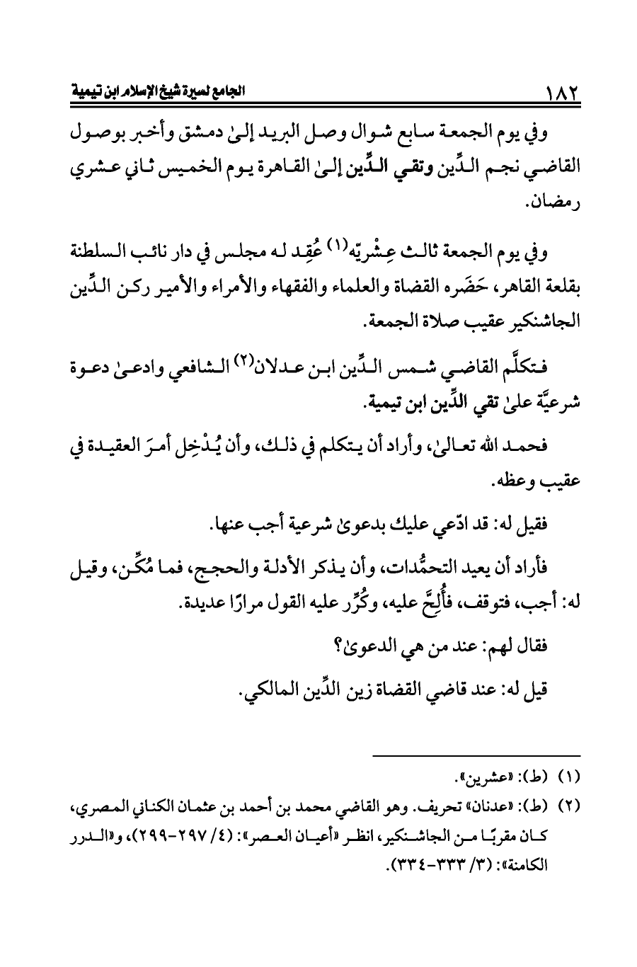 فتكلَّم القاضي شمس الدِّين ابن عدلان (¬٢) الشافعي وادعى دعوة شرعيَّة على تقي الدِّين ابن تيمية.