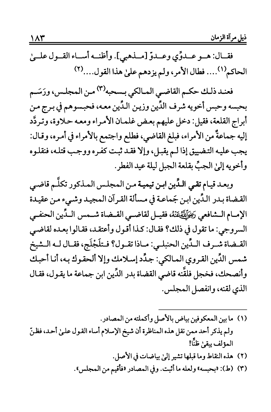 فعند ذلك حكم القاضي المالكي بسحبه (¬٣) من المجلس، ورَسَم بحبسه وحبس أخويه شرف الدِّين وزين الدِّين معه، فحبسوهم في برج من أبراج القلعة، فقيل: دخل عليهم بعض غلمان الأمراء ومعه حلاوة، وتردَّد إليه جماعةٌ من الأمراء، فبلغ القاضي، فطلع واجتمع بالأمراء في أمره، وقال: يجب عليه التضييق إذا لم يقبل، وإلا فقد ثبت كفره ووجب قتله، فنقلوه وأخويه إلى الجبِّ بقلعة الجبل ليلة عيد الفطر.