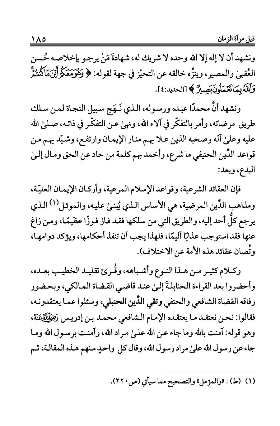ونشهد أنَّ محمدًا عبده ورسوله، الذي نَهَج سبيل النجاة لمن سلك طريق مرضاته، وأمر بالتفكّر في آلاء الله، ونهى عن التفكّر في ذاته، صلى الله عليه وعلى آله وصحبه الذين علا بهم منار الإيمان وارتفع، وشيّد بهم من قواعد الدِّين الحنيفي ما شرع، وأخمد بهم كلمة من حاد عن الحق ومال إلى البدع، وبعد: