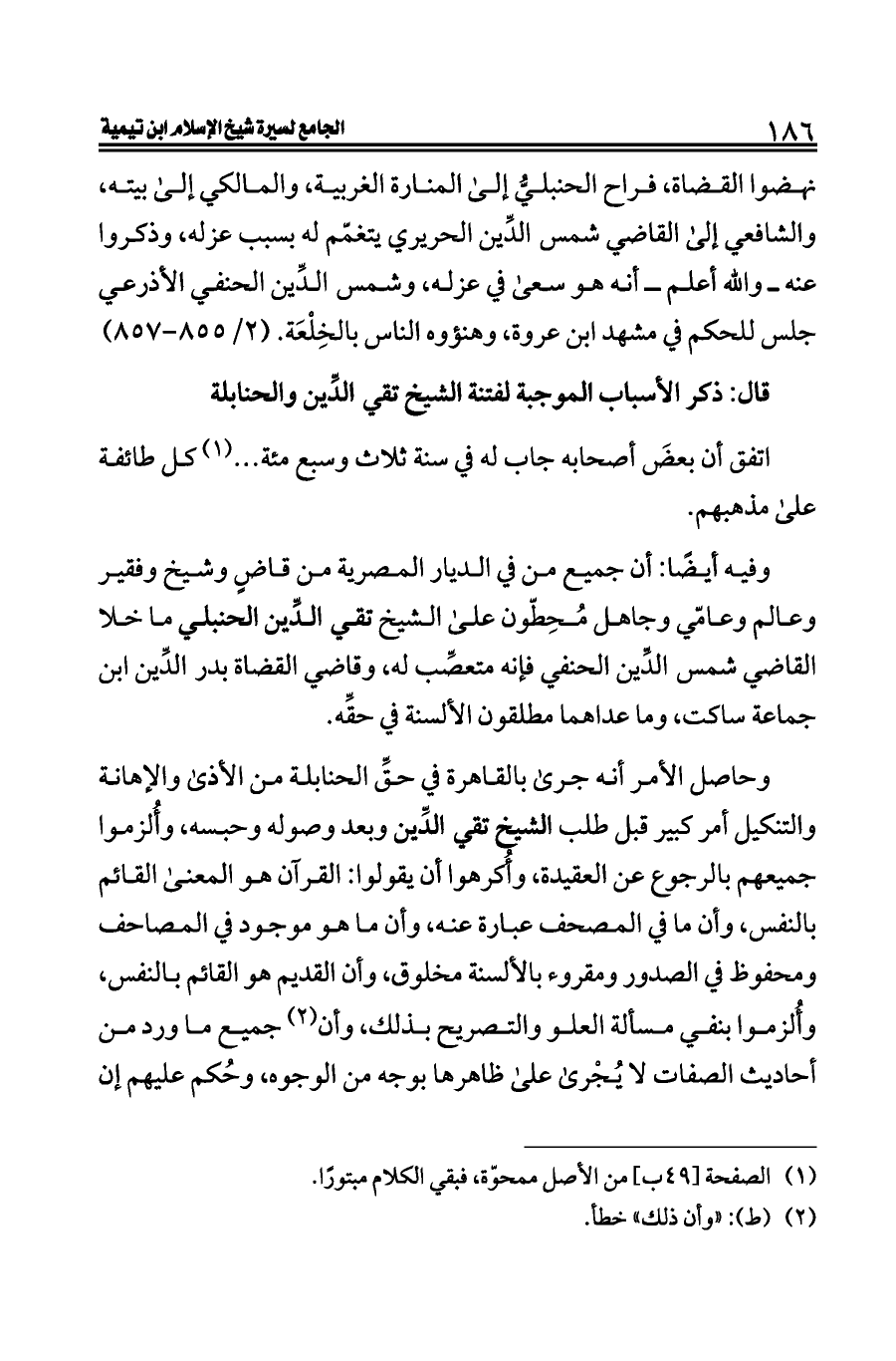قال: ذكر الأسباب الموجبة لفتنة الشيخ تقي الدِّين والحنابلة