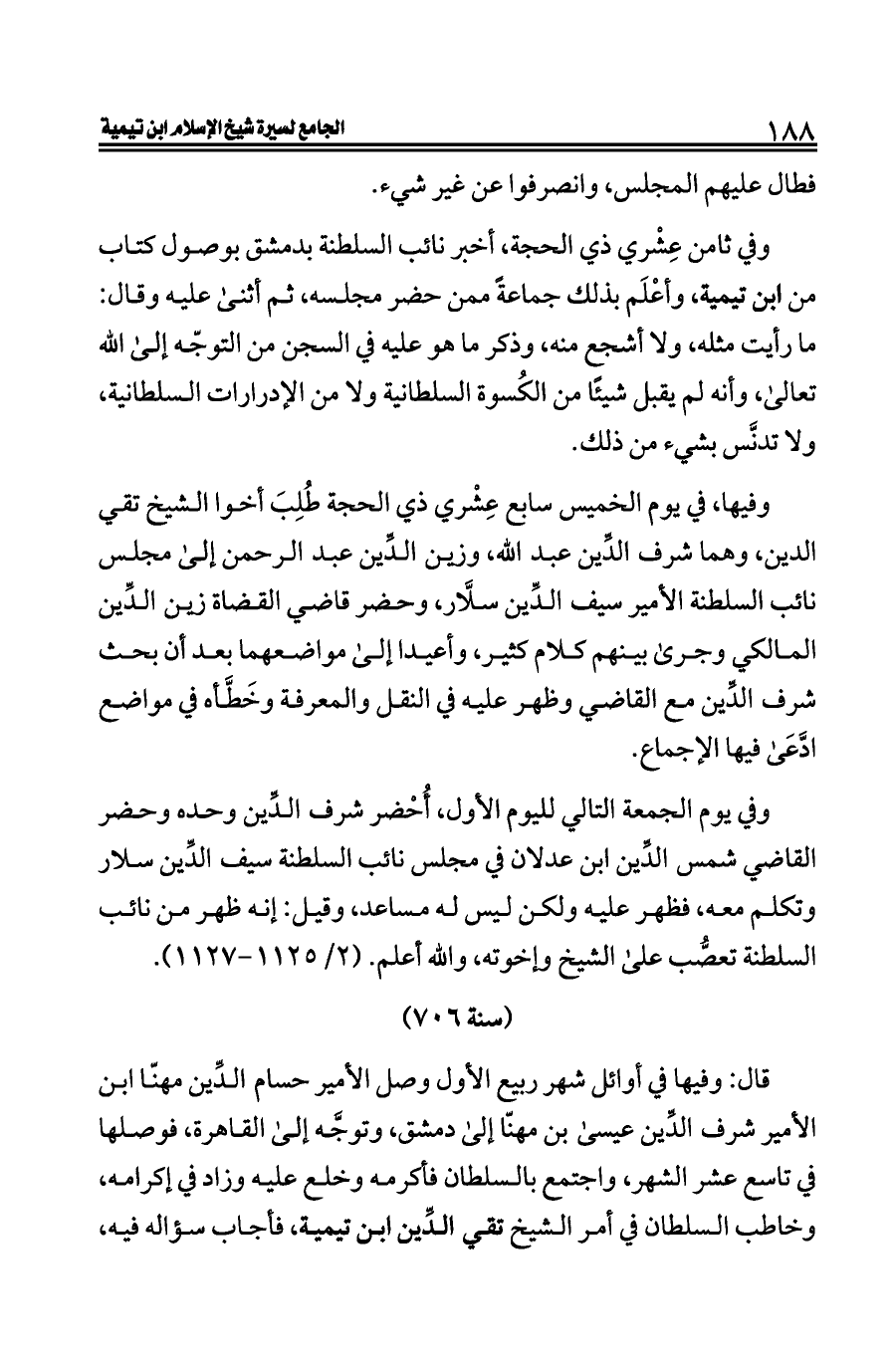 وفيها، في يوم الخميس سابع عِشْري ذي الحجة طُلِبَ أخوا الشيخ تقي الدين، وهما شرف الدِّين عبد الله، وزين الدِّين عبد الرحمن إلى مجلس نائب السلطنة الأمير سيف الدِّين سلَّار، وحضر قاضي القضاة زين الدِّين المالكي وجرى بينهم كلام كثير، وأعيدا إلى مواضعهما بعد أن بحث شرف الدِّين مع القاضي وظهر عليه في النقل والمعرفة وخَطَّأه في مواضع ادَّعَى فيها الإجماع.