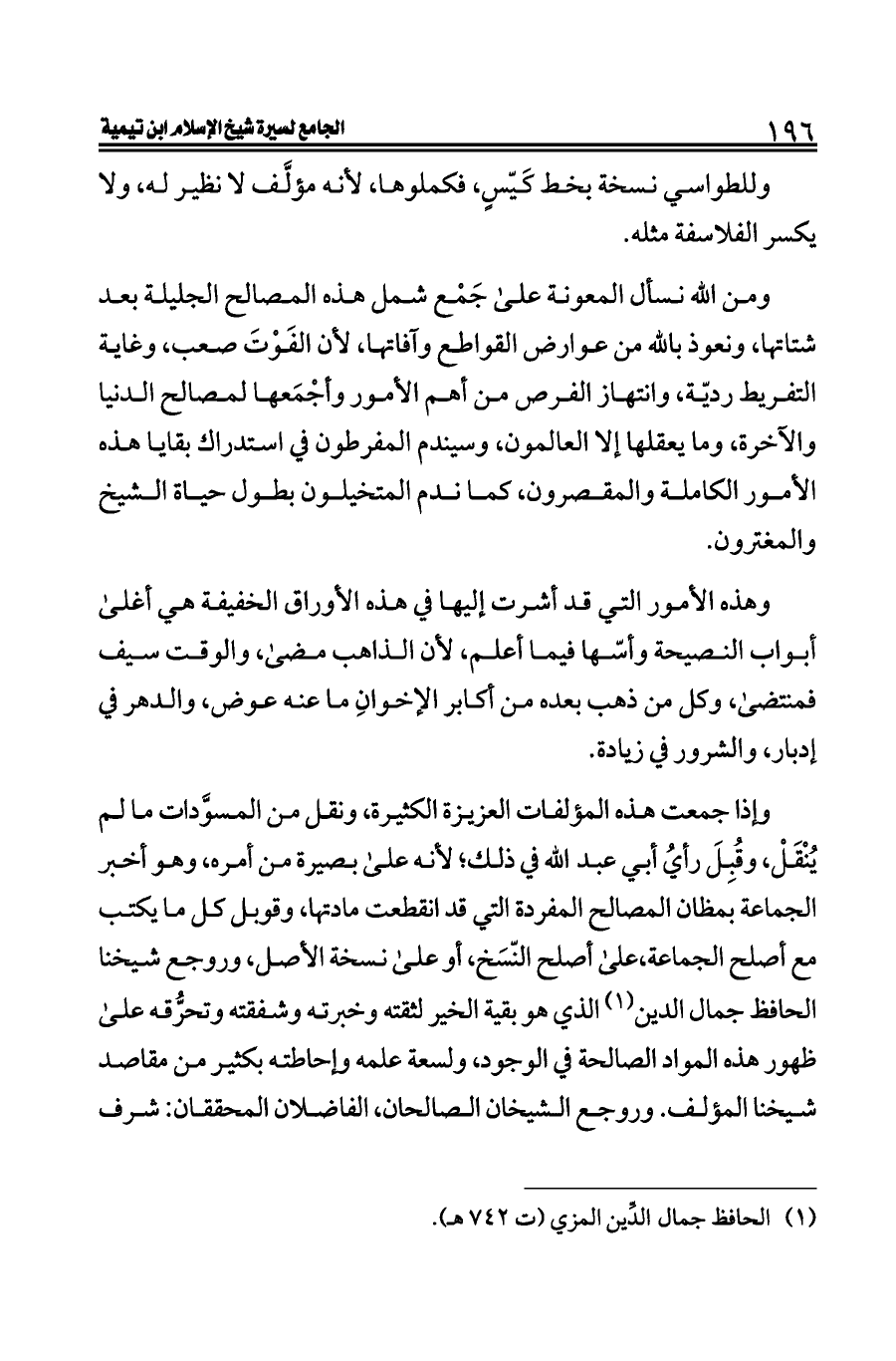 وإذا جمعت هذه المؤلفات العزيزة الكثيرة، ونقل من المسوَّدات ما لم يُنْقَلْ، وقُبِلَ رأيُ أبي عبد الله في ذلك؛ لأنه على بصيرة من أمره، وهو أخبر الجماعة بمظان المصالح المفردة التي قد انقطعت مادتها، وقوبل كل ما يكتب مع أصلح الجماعة، على أصلح النّسَخ، أو على نسخة الأصل، وروجع شيخنا الحافظ جمال الدين (¬١) الذي هو بقية الخير لثقته وخبرته وشفقته وتحرُّقه على ظهور هذه المواد الصالحة في الوجود، ولسعة علمه وإحاطته بكثير من مقاصد شيخنا المؤلف. وروجع الشيخان الصالحان، الفاضلان المحققان: شرف