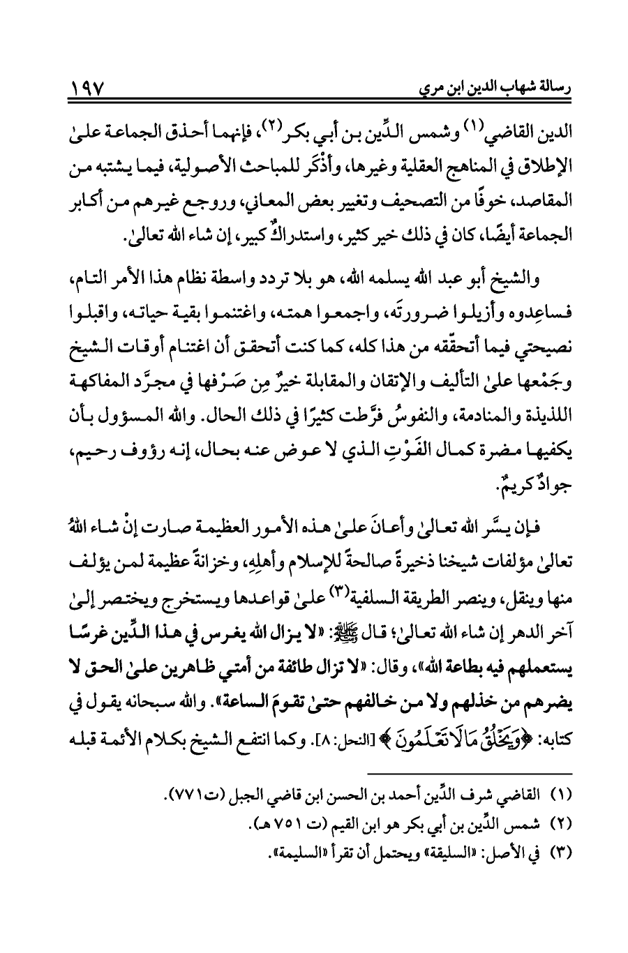 فإن يسَّر الله تعالى وأعانَ على هذه الأمور العظيمة صارت إنْ شاء اللهُ تعالى مؤلفات شيخنا ذخيرةً صالحةً للإسلام وأهلِهِ، وخزانةً عظيمة لمن يؤلف منها وينقل، وينصر الطريقة السلفية (¬٣) على قواعدها ويستخرج ويختصر إلى آخر الدهر إن شاء الله تعالى؛ قال - صلى الله عليه وسلم -: «لا يزال الله يغرس في هذا الدِّين غرسًا يستعملهم فيه بطاعة الله»، وقال: «لا تزال طائفة من أمتي ظاهرين على الحق لا يضرهم من خذلهم ولا من خالفهم حتى تقومَ الساعة». والله سبحانه يقول في كتابه: {وَيَخْلُقُ مَا لَا تَعْلَمُونَ} [النحل: ٨]. وكما انتفع الشيخ بكلام الأئمة قبله