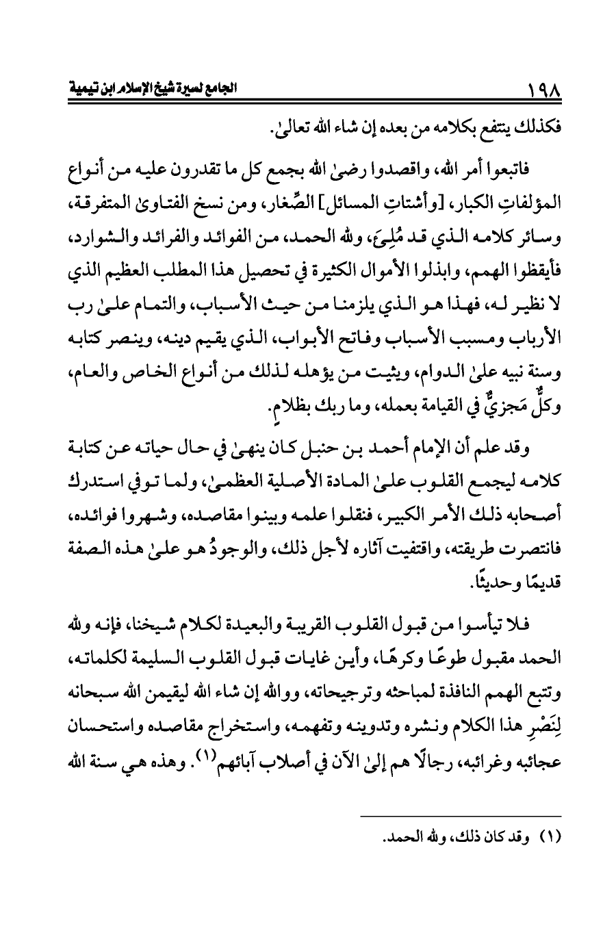 وقد علم أن الإمام أحمد بن حنبل كان ينهى في حال حياته عن كتابة كلامه ليجمع القلوب على المادة الأصلية العظمى، ولما توفي استدرك أصحابه ذلك الأمر الكبير، فنقلوا علمه وبينوا مقاصده، وشهروا فوائده، فانتصرت طريقته، واقتفيت آثاره لأجل ذلك، والوجودُ هو على هذه الصفة قديمًا وحديثًا.