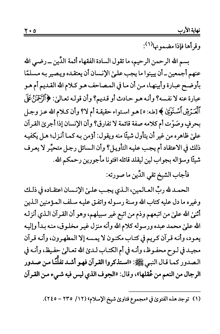 الحمد لله ربِّ العالمين، الذي يجب على الإنسان اعتقاده في ذلك وغيره ما دل عليه كتاب الله وسنة رسوله واتفق عليه سلف المؤمنين الذين أثنى الله على من اتبعهم وذم من اتبع غير سبيلهم، وهو أن القرآن الذي أنزله الله على محمد عبده ورسوله كلام الله وأنه منزل غير مخلوق، منه بدأ وإليه يعود، وأنه قرآن كريم في كتاب مكنون لا يمسه إلا المطهرون، وأنه قرآن مجيد في لوح محفوظ، وأنه في أم الكتاب لدى الله تعالى حفيظ، وأنه في الصدور كما قال النبي - صلى الله عليه وسلم -: «استذكروا القرآن فهو أشد تفلُّتًا من صدور الرجال من النعم من عُقلها»، وقال: «الجوف الذي ليس فيه شيء من القرآن