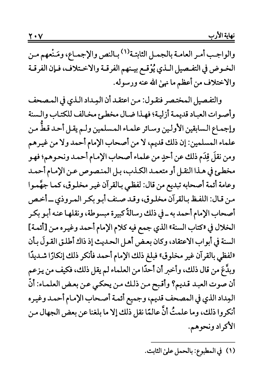 والتفصيل المختصر فنقول: من اعتقد أن المِداد الذي في المصحف وأصوات العباد قديمة أزلية؛ فهذا ضال مخطئ مخالف للكتاب والسنة وإجماع السابقين الأولين وسائر علماء المسلمين ولم يقل أحد قطُّ من علماء المسلمين: إن ذلك قديم، لا من أصحاب الإمام أحمد ولا من غيرهم ومن نقلَ قِدَم ذلك عن أحدٍ من علماء أصحاب الإمام أحمد ونحوهم؛ فهو مخطئ في هذا النقل أو متعمد الكذب، بل المنصوص عن الإمام أحمد وعامة أئمة أصحابه تبديع من قال: لفظي بالقرآن غير مخلوق، كما جهَّموا من قال: اللفظ بالقرآن مخلوق، وقد صنف أبو بكر المروذي ــ أخص أصحاب الإمام أحمد به ــ في ذلك رسالةً كبيرة مبسوطة، ونقلها عنه أبو بكر الخلال في «كتاب السنة» الذي جمع فيه كلام الإمام أحمد وغيره من [أئمة] السنة في أبواب الاعتقاد، وكان بعض أهل الحديث إذ ذاك أطلق القولَ بأن «لفظي بالقرآن غير مخلوق» فبلغ ذلك الإمام أحمد فأنكر ذلك إنكارًا شديدًا وبدَّعَ من قال ذلك، وأخبر أن أحدًا من العلماء لم يقل ذلك، فكيف من يزعم أن صوت العبد قديم؟ وأقبح من ذلك من يحكي عن بعض العلماء: أنّ المِداد الذي في المصحف قديم، وجميع أئمة أصحاب الإمام أحمد وغيره أنكروا ذلك، وما علمتُ أنَّ عالمًا نقل ذلك إلا ما بلغنا عن بعض الجهال من الأكراد ونحوهم.