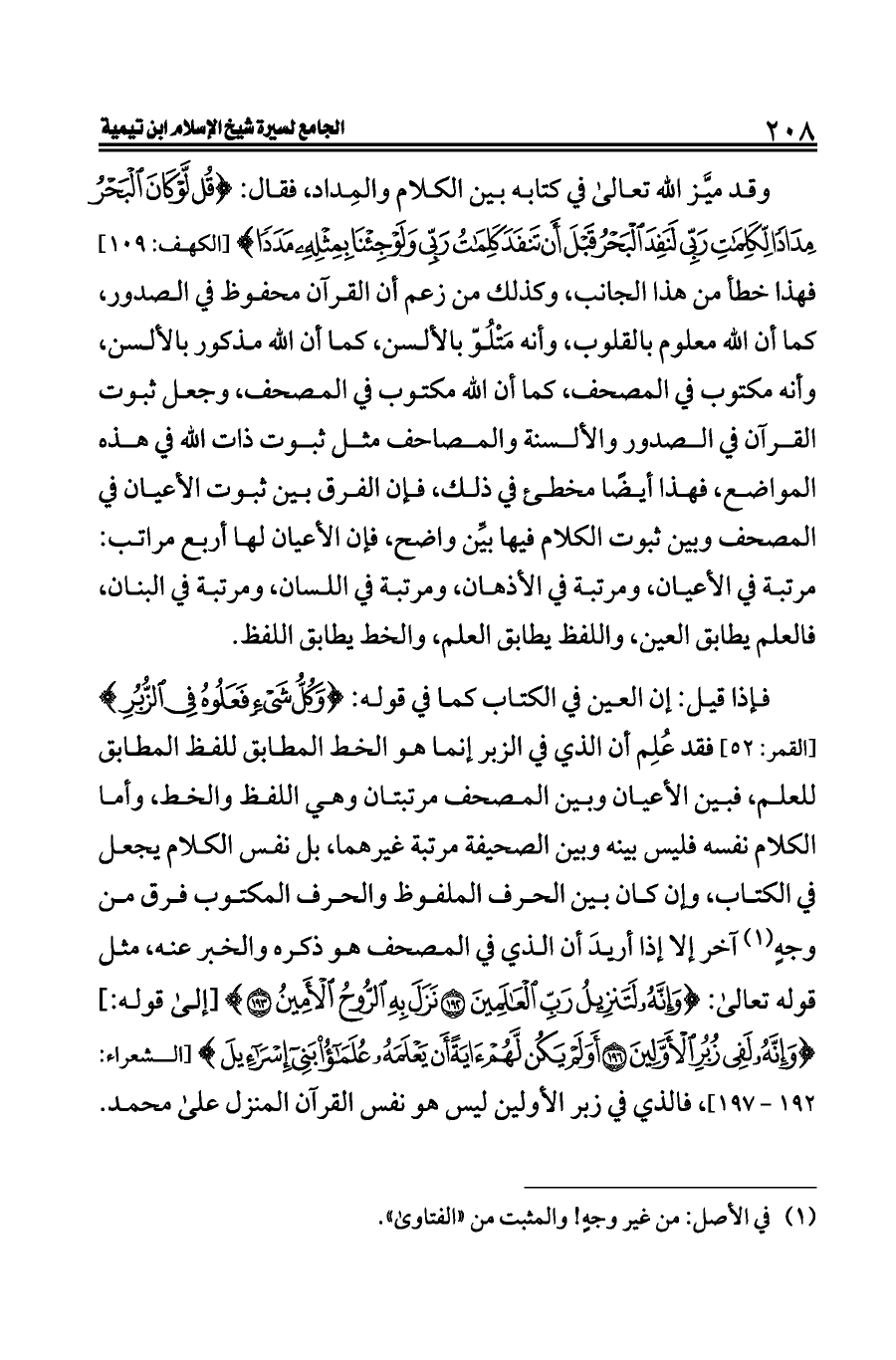 فإذا قيل: إن العين في الكتاب كما في قوله: {وَكُلُّ شَيْءٍ فَعَلُوهُ فِي الزُّبُرِ} [القمر: ٥٢] فقد عُلِم أن الذي في الزبر إنما هو الخط المطابق للفظ المطابق للعلم، فبين الأعيان وبين المصحف مرتبتان وهي اللفظ والخط، وأما الكلام نفسه فليس بينه وبين الصحيفة مرتبة غيرهما، بل نفس الكلام يجعل في الكتاب، وإن كان بين الحرف الملفوظ والحرف المكتوب فرق من وجهٍ (¬١) آخر إلا إذا أريدَ أن الذي في المصحف هو ذكره والخبر عنه، مثل قوله تعالى: {وَإِنَّهُ لَتَنْزِيلُ رَبِّ الْعَالَمِينَ (١٩٢) نَزَلَ بِهِ الرُّوحُ الْأَمِينُ (١٩٣)} [إلى قوله: ] {وَإِنَّهُ لَفِي زُبُرِ الْأَوَّلِينَ (١٩٦) أَوَلَمْ يَكُنْ لَهُمْ آيَةً أَنْ يَعْلَمَهُ عُلَمَاءُ بَنِي إِسْرَائِيلَ} [الشعراء: ١٩٢ - ١٩٧]، فالذي في زبر الأولين ليس هو نفس القرآن المنزل على محمد.