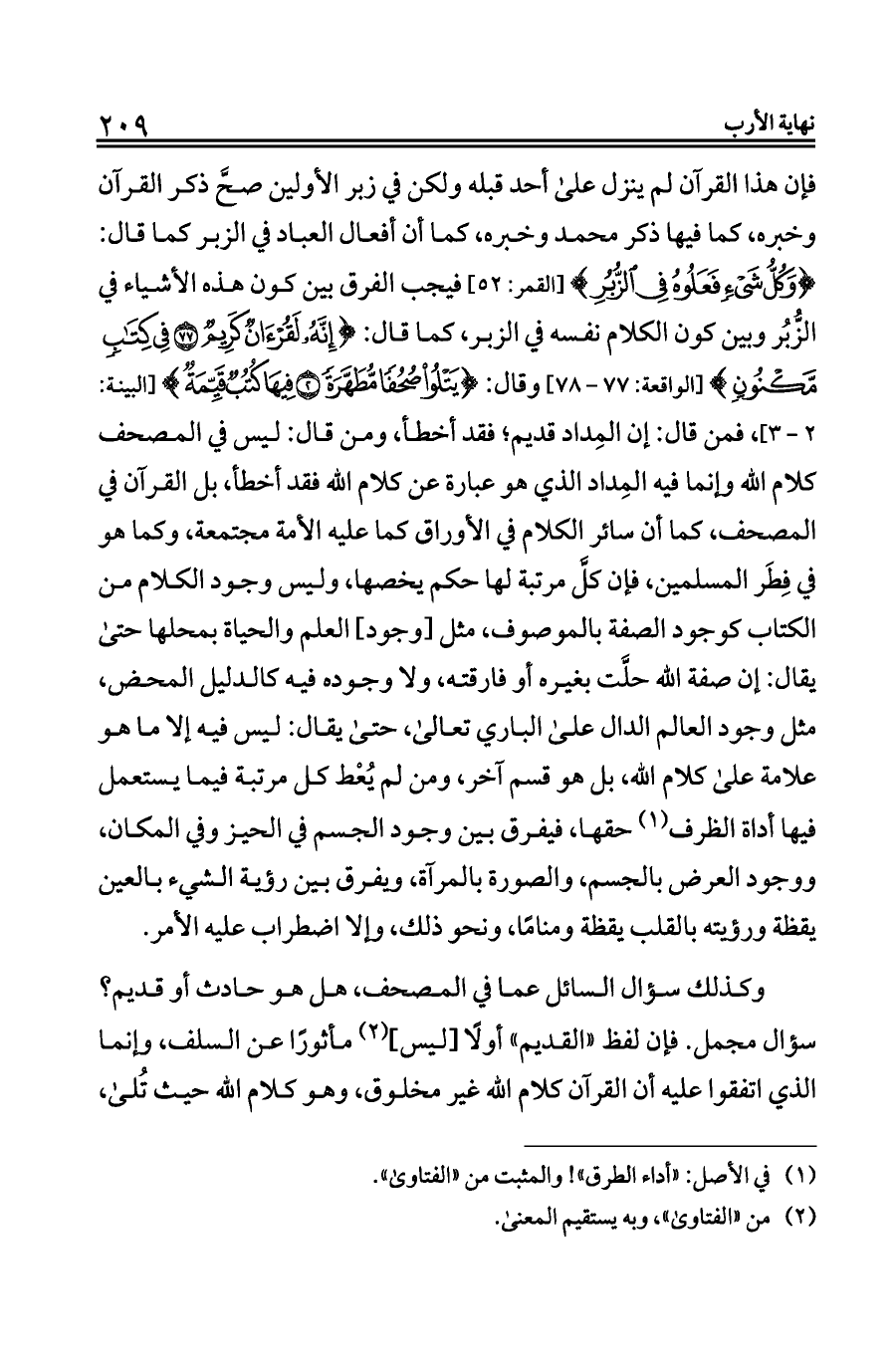 فإن هذا القرآن لم ينزل على أحد قبله ولكن في زبر الأولين صحَّ ذكر القرآن وخبره، كما فيها ذكر محمد وخبره، كما أن أفعال العباد في الزبر كما قال: {وَكُلُّ شَيْءٍ فَعَلُوهُ فِي الزُّبُرِ} [القمر: ٥٢] فيجب الفرق بين كون هذه الأشياء في الزُّبُر وبين كون الكلام نفسه في الزبر، كما قال: {إِنَّهُ لَقُرْآنٌ كَرِيمٌ (٧٧) فِي كِتَابٍ مَكْنُونٍ} [الواقعة: ٧٧ - ٧٨] وقال: {صُحُفًا مُطَهَّرَةً (٢) فِيهَا كُتُبٌ قَيِّمَةٌ (٣)} [البينة: ٢ - ٣]، فمن قال: إن المِداد قديم؛ فقد أخطأ، ومن قال: ليس في المصحف كلام الله وإنما فيه المِداد الذي هو عبارة عن كلام الله فقد أخطأ، بل القرآن في المصحف، كما أن سائر الكلام في الأوراق كما عليه الأمة مجتمعة، وكما هو في فِطَر المسلمين، فإن كلَّ مرتبة لها حكم يخصها، وليس وجود الكلام من الكتاب كوجود الصفة بالموصوف، مثل [وجود] العلم والحياة بمحلها حتى يقال: إن صفة الله حلَّت بغيره أو فارقته، ولا وجوده فيه كالدليل المحض، مثل وجود العالم الدال على الباري تعالى، حتى يقال: ليس فيه إلا ما هو علامة على كلام الله، بل هو قسم آخر، ومن لم يُعْط كل مرتبة فيما يستعمل فيها أداة الظرف (¬١) حقها، فيفرق بين وجود الجسم في الحيز وفي المكان، ووجود العرض بالجسم، والصورة بالمرآة، ويفرق بين رؤية الشيء بالعين يقظة ورؤيته بالقلب يقظة ومنامًا، ونحو ذلك، وإلا اضطراب عليه الأمر.