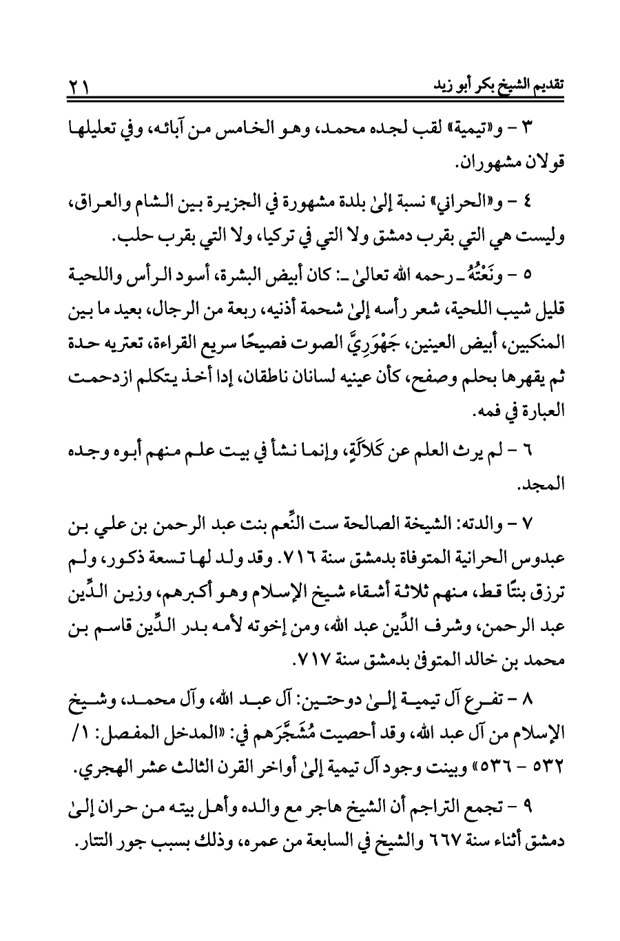٣ - و «تيمية» لقب لجده محمد، وهو الخامس من آبائه، وفي تعليلها قولان مشهوران.