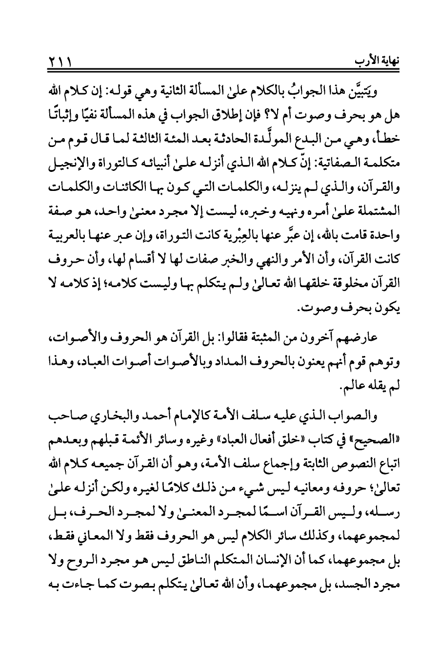 والصواب الذي عليه سلف الأمة كالإمام أحمد والبخاري صاحب «الصحيح» في كتاب «خلق أفعال العباد» وغيره وسائر الأئمة قبلهم وبعدهم اتباع النصوص الثابتة وإجماع سلف الأمة، وهو أن القرآن جميعه كلام الله تعالى؛ حروفه ومعانيه ليس شيء من ذلك كلامًا لغيره ولكن أنزله على رسله، وليس القرآن اسمًا لمجرد المعنى ولا لمجرد الحرف، بل لمجموعهما، وكذلك سائر الكلام ليس هو الحروف فقط ولا المعاني فقط، بل مجموعهما، كما أن الإنسان المتكلم الناطق ليس هو مجرد الروح ولا مجرد الجسد، بل مجموعهما، وأن الله تعالى يتكلم بصوت كما جاءت به