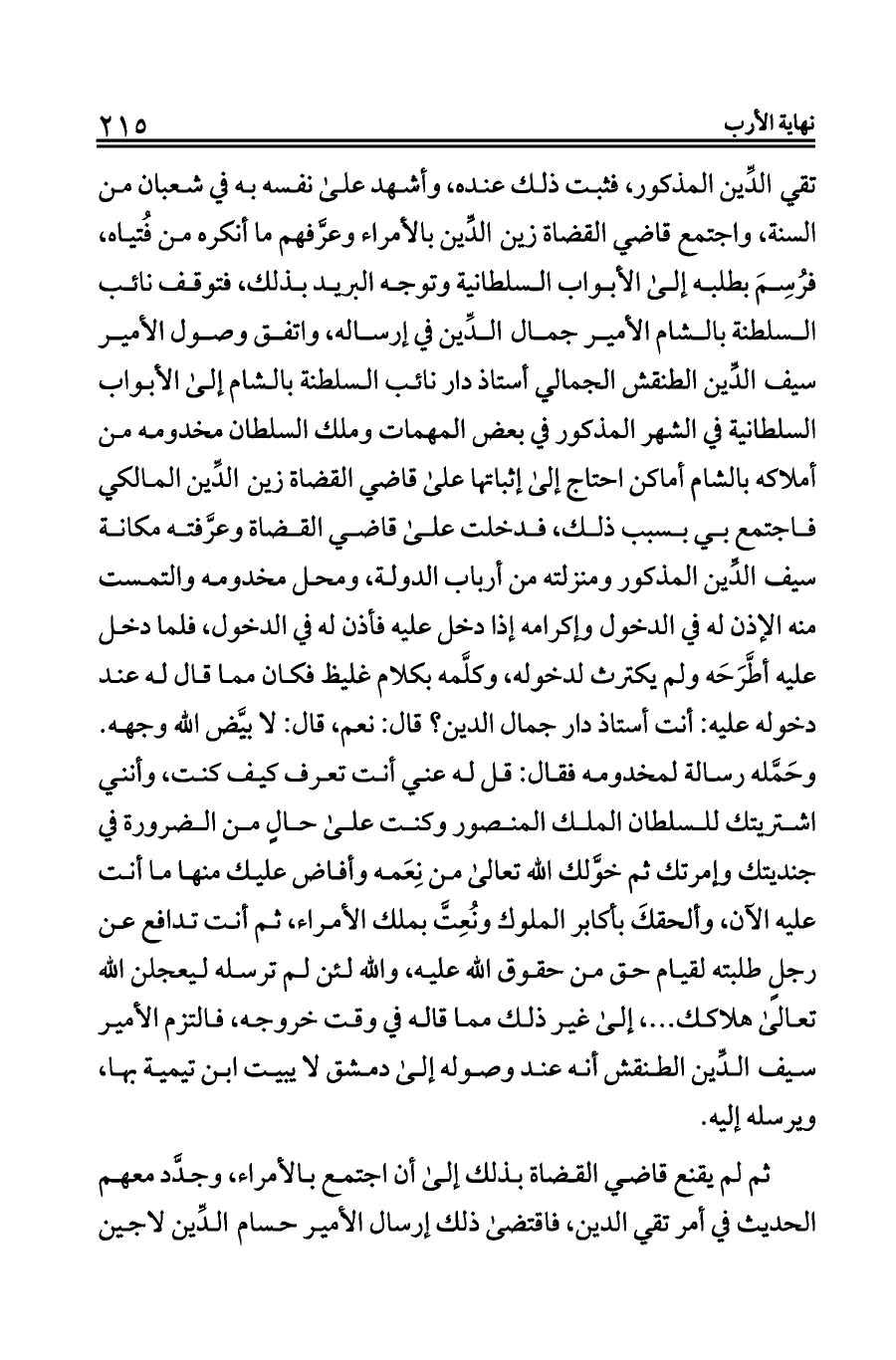 ثم لم يقنع قاضي القضاة بذلك إلى أن اجتمع بالأمراء، وجدَّد معهم الحديث في أمر تقي الدين، فاقتضى ذلك إرسال الأمير حسام الدِّين لاجين