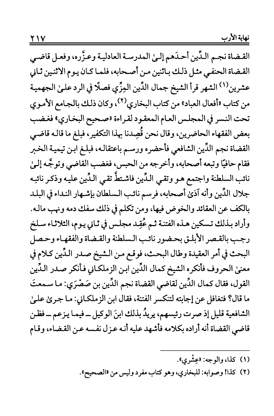 القضاة نجم الدِّين أحدَهم إلى المدرسة العادلية وعزَّره، وفعل قاضي القضاة الحنفي مثل ذلك باثنين من أصحابه، فلما كان يوم الاثنين ثاني عشرين (¬١) الشهر قرأ الشيخ جمال الدِّين المِزِّي فصلًا في الرد على الجهمية من كتاب «أفعال العباد» من كتاب البخاري (¬٢)، وكان ذلك بالجامع الأموي تحت النسر في المجلس العام المعقود لقراءة «صحيح البخاري» فغضب بعض الفقهاء الحاضرين، وقال نحن قُصِدنا بهذا التكفير، فبلغ ما قاله قاضي القضاة نجم الدِّين الشافعي فأحضره ورسم باعتقاله، فبلغ ابن تيمية الخبر فقام حافيًا وتبعه أصحابه، وأخرجه من الحبس، فغضب القاضي وتوجَّه إلى نائب السلطنة واجتمع هو وتقي الدِّين فاشتطَّ تقي الدِّين عليه وذكر نائبه جلال الدِّين وأنه آذى أصحابه، فرسم نائب السلطان بإشهار النداء في البلد بالكف عن العقائد والخوض فيها، ومن تكلم في ذلك سفك دمه ونهب ماله.