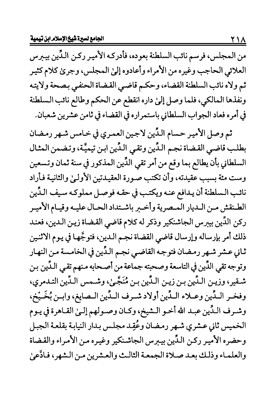 المجلس، فرسم نائب السلطنة بعوده، فأدركه الأمير ركن الدِّين بيبرس العلائي الحاجب وغيره من الأمراء وأعادوه إلى المجلس، وجرى كلام كثير ثم ولاه نائب السلطنة القضاء، وحكم قاضي القضاة الحنفي بصحة ولايته ونفذها المالكي، فلما وصل إلى داره انقطع عن الحكم وطالع نائب السلطنة في أمره فعاد الجواب السلطاني باستمراره في القضاء في ثامن عشرين شعبان.