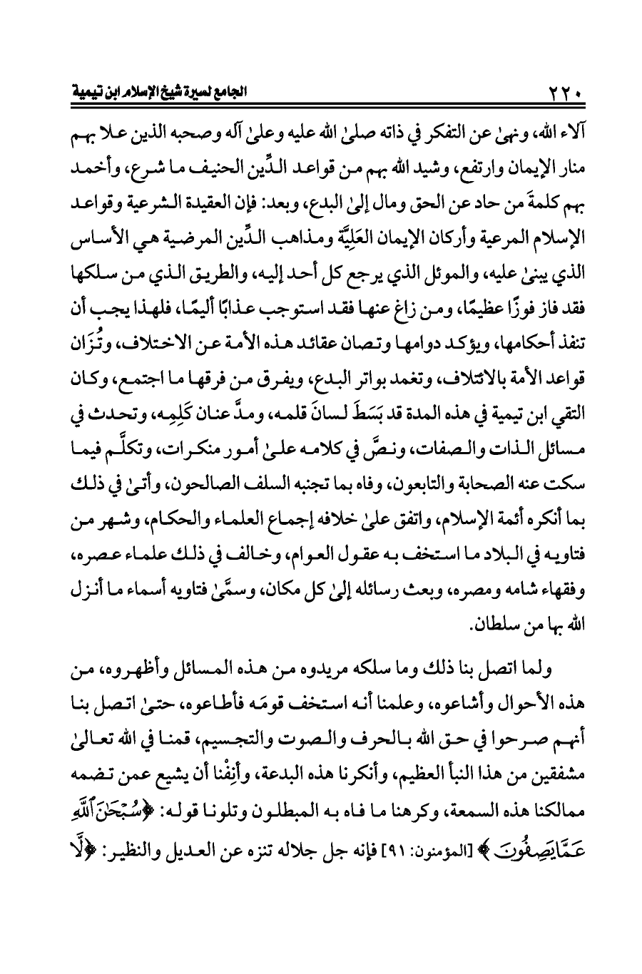 آلاء الله، ونهى عن التفكر في ذاته صلى الله عليه وعلى آله وصحبه الذين علا بهم منار الإيمان وارتفع، وشيد الله بهم من قواعد الدِّين الحنيف ما شرع، وأخمد بهم كلمةَ من حاد عن الحق ومال إلى البدع، وبعد: فإن العقيدة الشرعية وقواعد الإسلام المرعية وأركان الإيمان العَلِيَّة ومذاهب الدِّين المرضية هي الأساس الذي يبنى عليه، والموئل الذي يرجع كل أحد إليه، والطريق الذي من سلكها فقد فاز فوزًا عظيمًا، ومن زاغ عنها فقد استوجب عذابًا أليمًا، فلهذا يجب أن تنفذ أحكامها، ويؤكد دوامها وتصان عقائد هذه الأمة عن الاختلاف، وتُزَان قواعد الأمة بالائتلاف، وتغمد بواتر البدع، ويفرق من فرقها ما اجتمع، وكان التقي ابن تيمية في هذه المدة قد بَسَطَ لسانَ قلمه، ومدَّ عنان كَلِمِه، وتحدث في مسائل الذات والصفات، ونصَّ في كلامه على أمور منكرات، وتكلَّم فيما سكت عنه الصحابة والتابعون، وفاه بما تجنبه السلف الصالحون، وأتى في ذلك بما أنكره أئمة الإسلام، واتفق على خلافه إجماع العلماء والحكام، وشهر من فتاويه في البلاد ما استخف به عقول العوام، وخالف في ذلك علماء عصره، وفقهاء شامه ومصره، وبعث رسائله إلى كل مكان، وسمَّى فتاويه أسماء ما أنزل الله بها من سلطان.