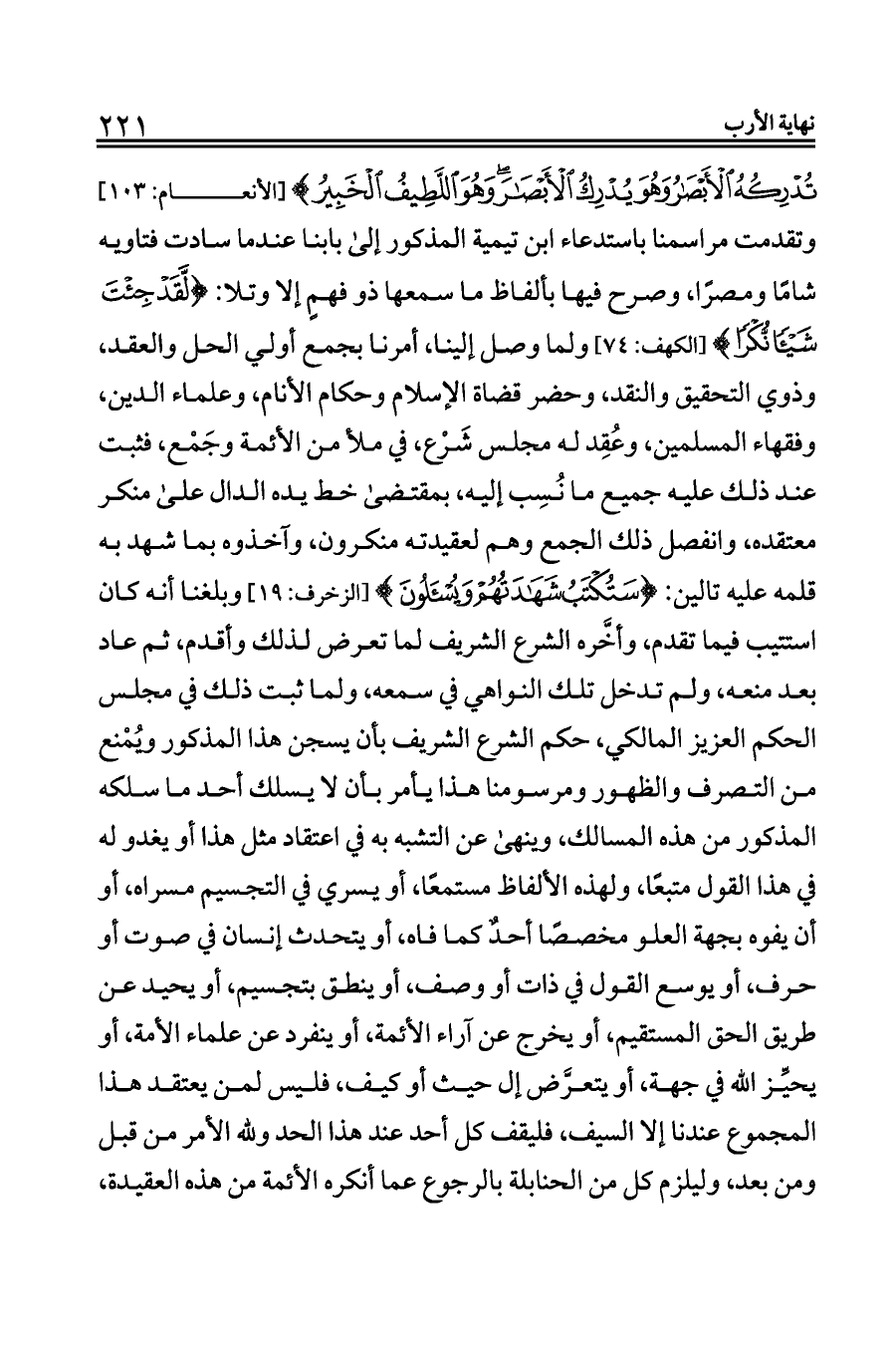 تُدْرِكُهُ الْأَبْصَارُ وَهُوَ يُدْرِكُ الْأَبْصَارَ وَهُوَ اللَّطِيفُ الْخَبِيرُ} [الأنعام: ١٠٣] وتقدمت مراسمنا باستدعاء ابن تيمية المذكور إلى بابنا عندما سادت فتاويه شامًا ومصرًا، وصرح فيها بألفاظ ما سمعها ذو فهمٍ إلا وتلا: {لَقَدْ جِئْتَ شَيْئًا نُكْرًا} [الكهف: ٧٤] ولما وصل إلينا، أمرنا بجمع أولي الحل والعقد، وذوي التحقيق والنقد، وحضر قضاة الإسلام وحكام الأنام، وعلماء الدين، وفقهاء المسلمين، وعُقِد له مجلس شَرْع، في ملأ من الأئمة وجَمْع، فثبت عند ذلك عليه جميع ما نُسِب إليه، بمقتضى خط يده الدال على منكر معتقده، وانفصل ذلك الجمع وهم لعقيدته منكرون، وآخذوه بما شهد به قلمه عليه تالين: {سَتُكْتَبُ شَهَادَتُهُمْ وَيُسْأَلُونَ} [الزخرف: ١٩] وبلغنا أنه كان استتيب فيما تقدم، وأخَّره الشرع الشريف لما تعرض لذلك وأقدم، ثم عاد بعد منعه، ولم تدخل تلك النواهي في سمعه، ولما ثبت ذلك في مجلس الحكم العزيز المالكي، حكم الشرع الشريف بأن يسجن هذا المذكور ويُمْنع من التصرف والظهور ومرسومنا هذا يأمر بأن لا يسلك أحد ما سلكه المذكور من هذه المسالك، وينهى عن التشبه به في اعتقاد مثل هذا أو يغدو له في هذا القول متبعًا، ولهذه الألفاظ مستمعًا، أو يسري في التجسيم مسراه، أو أن يفوه بجهة العلو مخصصًا أحدٌ كما فاه، أو يتحدث إنسان في صوت أو حرف، أو يوسع القول في ذات أو