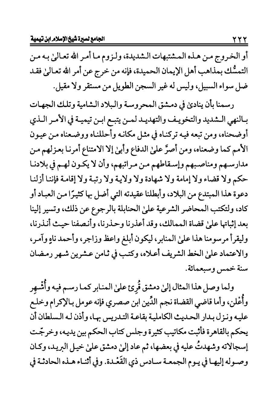 رسمنا بأن ينادى في دمشق المحروسة والبلاد الشامية وتلك الجهات بالنهي الشديد والتخويف والتهديد لمن يتبع ابن تيمية في الأمر الذي أوضحناه، ومن تبعه فيه تركناه في مثل مكانه وأحللناه ووضعناه من عيون الأمم كما وضعناه، ومن أصرَّ على الدفاع وأبى إلا الامتناع أمرنا بعزلهم من مدارسهم ومناصبهم وإسقاطهم من مراتبهم، وأن لا يكون لهم في بلادنا حكم ولا قضاء ولا إمامة ولا شهادة ولا ولاية ولا رتبة ولا إقامة فإننا أزلنا دعوة هذا المبتدع من البلاد، وأبطلنا عقيدته التي أضل بها كثيرًا من العباد أو كاد، ولتكتب المحاضر الشرعية على الحنابلة بالرجوع عن ذلك، وتسير إلينا بعد إثباتها على قضاة الممالك، وقد أعذرنا وحذرنا، وأنصفنا حيث أنذرنا، وليقرأ مرسومنا هذا على المنابر، ليكون أبلغ واعظ وزاجر، وأحمد ناهٍ وآمر، والاعتماد على الخط الشريف أعلاه، وكتب في ثامن عشرين شهر رمضان سنة خمس وسبعمائة.