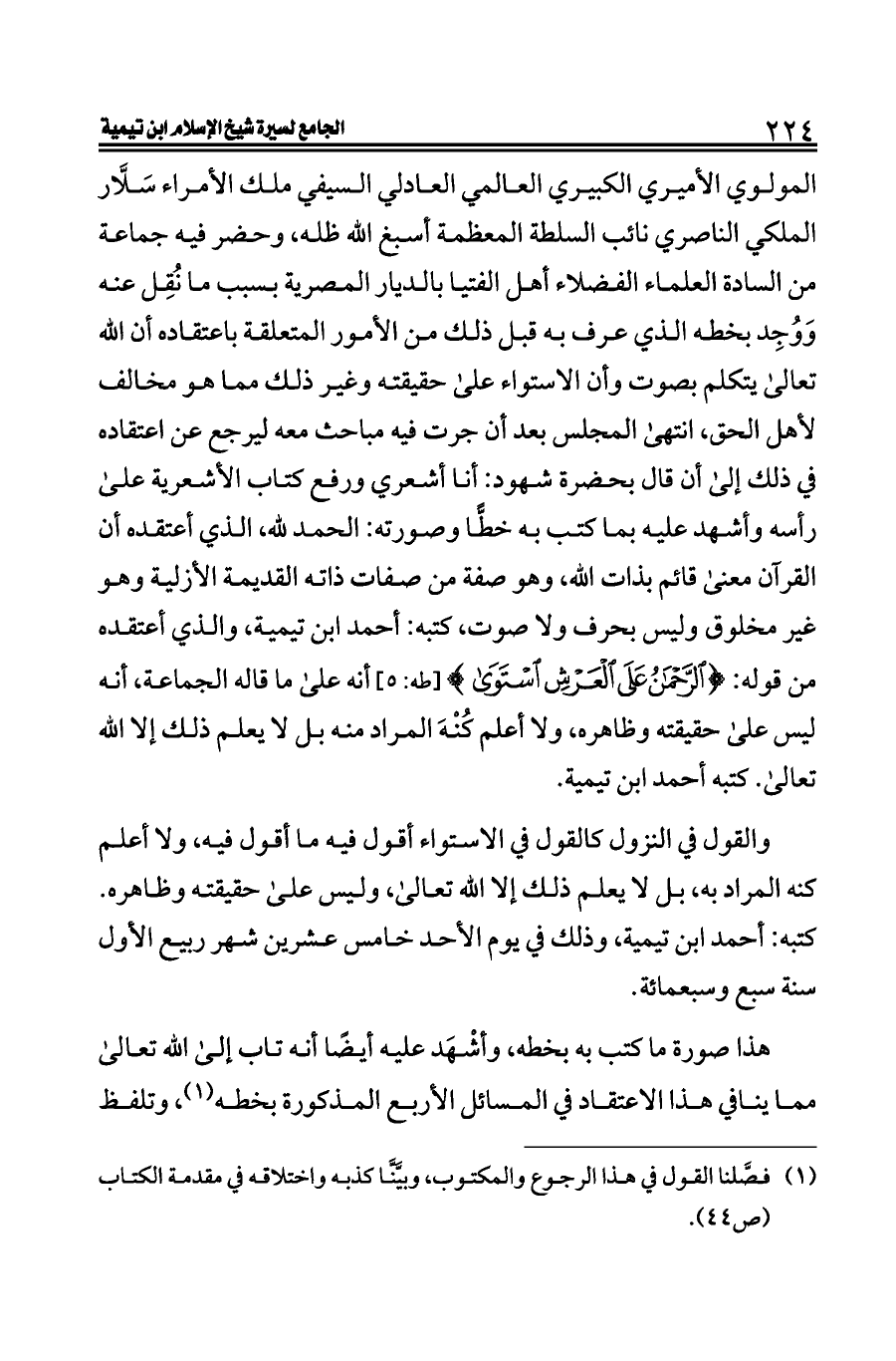 المولوي الأميري الكبيري العالمي العادلي السيفي ملك الأمراء سَلَّار الملكي الناصري نائب السلطة المعظمة أسبغ الله ظله، وحضر فيه جماعة من السادة العلماء الفضلاء أهل الفتيا بالديار المصرية بسبب ما نُقِل عنه وَوُجِد بخطه الذي عرف به قبل ذلك من الأمور المتعلقة باعتقاده أن الله تعالى يتكلم بصوت وأن الاستواء على حقيقته وغير ذلك مما هو مخالف لأهل الحق، انتهى المجلس بعد أن جرت فيه مباحث معه ليرجع عن اعتقاده في ذلك إلى أن قال بحضرة شهود: أنا أشعري ورفع كتاب الأشعرية على رأسه وأشهد عليه بما كتب به خطًّا وصورته: الحمد لله، الذي أعتقده أن القرآن معنى قائم بذات الله، وهو صفة من صفات ذاته القديمة الأزلية وهو غير مخلوق وليس بحرف ولا صوت، كتبه: أحمد ابن تيمية، والذي أعتقده من قوله: {الرَّحْمَنُ عَلَى الْعَرْشِ اسْتَوَى} [طه: ٥] أنه على ما قاله الجماعة، أنه ليس على حقيقته وظاهره، ولا أعلم كُنْهَ المراد منه بل لا يعلم ذلك إلا الله تعالى. كتبه أحمد ابن تيمية.