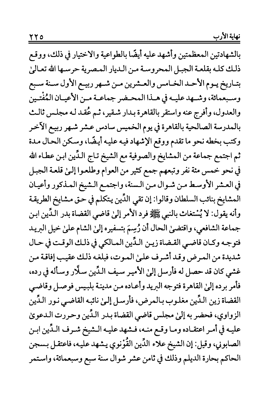 بالشهادتين المعظمتين وأشهد عليه أيضًا بالطواعية والاختيار في ذلك، ووقع ذلك كله بقلعة الجبل المحروسة من الديار المصرية حرسها الله تعالى بتاريخ يوم الأحد الخامس والعشرين من شهر ربيع الأول سنة سبع وسبعمائة، وشهد عليه في هذا المحضر جماعة من الأعيان المُفْتين والعدول، وأفرج عنه واستقر بالقاهرة بدار شقير، ثم عُقد له مجلس ثالث بالمدرسة الصالحية بالقاهرة في يوم الخميس سادس عشر شهر ربيع الآخر وكتب بخطه نحو ما تقدم ووقع الإشهاد فيه عليه أيضًا، وسكن الحال مدة ثم اجتمع جماعة من المشايخ والصوفية مع الشيخ تاج الدِّين ابن عطاء الله في نحو خمس مئة نفر وتبعهم جمع كثير من العوام وطلعوا إلى قلعة الجبل في العشر الأوسط من شوال من السنة، واجتمع الشيخ المذكور وأعيان المشايخ بنائب السلطان وقالوا: إن تقي الدِّين يتكلم في حق مشايخ الطريقة وأنه يقول: لا يُسْتغاث بالنبي - صلى الله عليه وسلم - فرد الأمر إلى قاضي القضاة بدر الدِّين ابن جماعة الشافعي، واقتضى الحال أن رُسِمَ بتسفيره إلى الشام على خيل البريد فتوجه وكان قاضي القضاة زين الدِّين المالكي في ذلك الوقت في حال شديدة من المرض وقد أشرف على الموت، فبلغه ذلك عقيب إفاقة من غشي كان قد حصل له فأرسل إلى الأمير سيف الدِّين سلَّار وسأله في رده، فأمر برده إلى القاهرة فتوجه البريد وأعاده من مدينة بلبيس فوصل وقاضي القضاة زين الدِّين مغلوب بالمرض، فأرسل إلى نائبه القاضي نور الدِّين الزواوي، فحضر به إلى مجلس قاضي القضاة بدر الدِّين وحررت الدعوى عليه في أمر اعتقاده وما وقع منه، فشهد عليه الشيخ شرف الدِّين ابن الصابوني، وقيل: إن الشيخ