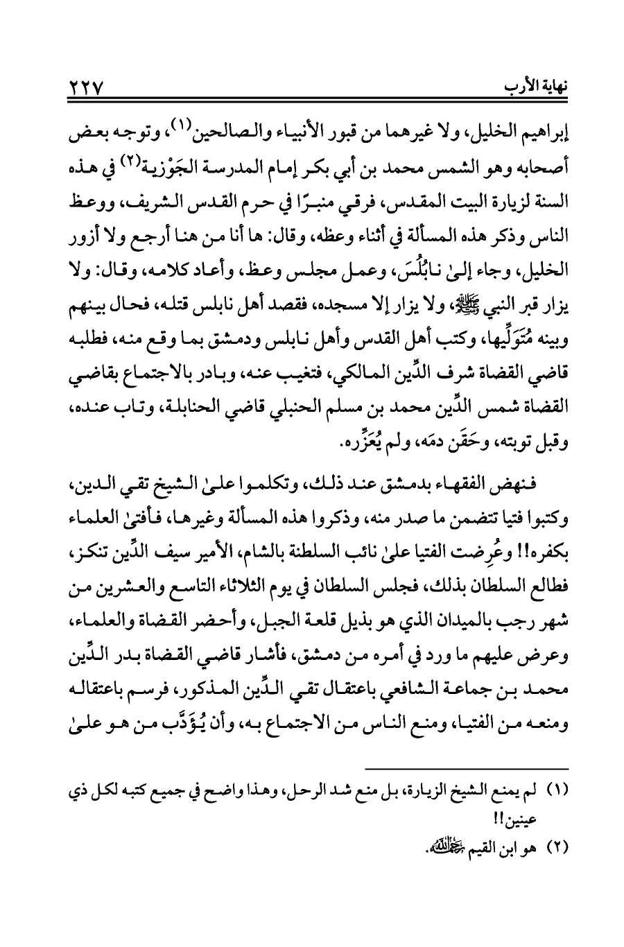 إبراهيم الخليل، ولا غيرهما من قبور الأنبياء والصالحين (¬١)، وتوجه بعض أصحابه وهو الشمس محمد بن أبي بكر إمام المدرسة الجَوْزية (¬٢) في هذه السنة لزيارة البيت المقدس، فرقي منبرًا في حرم القدس الشريف، ووعظ الناس وذكر هذه المسألة في أثناء وعظه، وقال: ها أنا من هنا أرجع ولا أزور الخليل، وجاء إلى نابُلُسَ، وعمل مجلس وعظ، وأعاد كلامه، وقال: ولا يزار قبر النبي - صلى الله عليه وسلم -، ولا يزار إلا مسجده، فقصد أهل نابلس قتله، فحال بينهم وبينه مُتَوَلِّيها، وكتب أهل القدس وأهل نابلس ودمشق بما وقع منه، فطلبه قاضي القضاة شرف الدِّين المالكي، فتغيب عنه، وبادر بالاجتماع بقاضي القضاة شمس الدِّين محمد بن مسلم الحنبلي قاضي الحنابلة، وتاب عنده، وقبل توبته، وحَقَن دمَه، ولم يُعَزِّره.