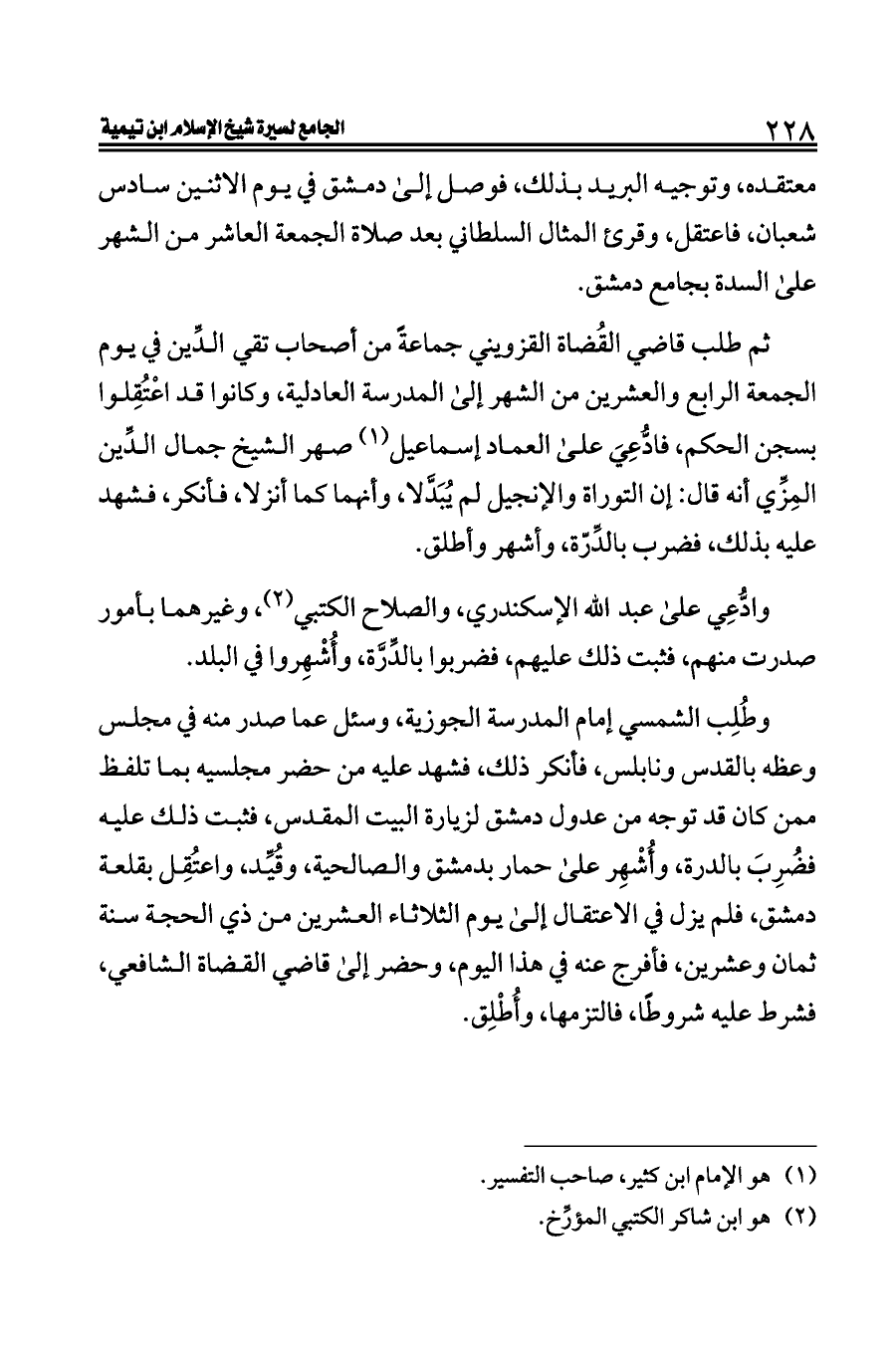 ثم طلب قاضي القُضاة القزويني جماعةً من أصحاب تقي الدِّين في يوم الجمعة الرابع والعشرين من الشهر إلى المدرسة العادلية، وكانوا قد اعْتُقِلوا بسجن الحكم، فادُّعِيَ على العماد إسماعيل (¬١) صهر الشيخ جمال الدِّين المِزِّي أنه قال: إن التوراة والإنجيل لم يُبَدَّلا، وأنهما كما أنزلا، فأنكر، فشهد عليه بذلك، فضرب بالدِّرّة، وأشهر وأطلق.