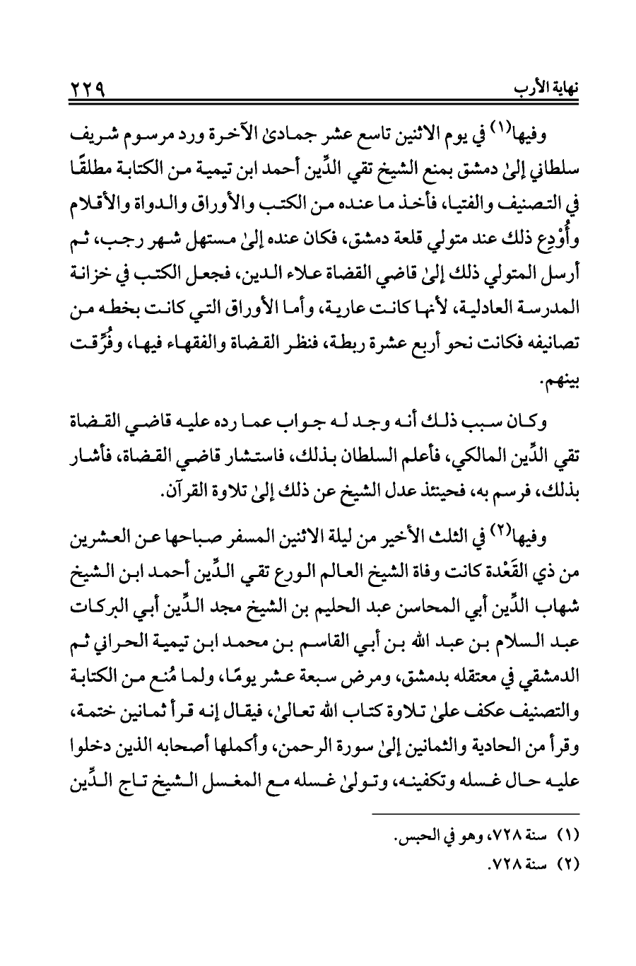 وفيها (¬٢) في الثلث الأخير من ليلة الاثنين المسفر صباحها عن العشرين من ذي القَعْدة كانت وفاة الشيخ العالم الورع تقي الدِّين أحمد ابن الشيخ شهاب الدِّين أبي المحاسن عبد الحليم بن الشيخ مجد الدِّين أبي البركات عبد السلام بن عبد الله بن أبي القاسم بن محمد ابن تيمية الحراني ثم الدمشقي في معتقله بدمشق، ومرض سبعة عشر يومًا، ولما مُنع من الكتابة والتصنيف عكف على تلاوة كتاب الله تعالى، فيقال إنه قرأ ثمانين ختمة، وقرأ من الحادية والثمانين إلى سورة الرحمن، وأكملها أصحابه الذين دخلوا عليه حال غسله وتكفينه، وتولى غسله مع المغسل الشيخ تاج الدِّين