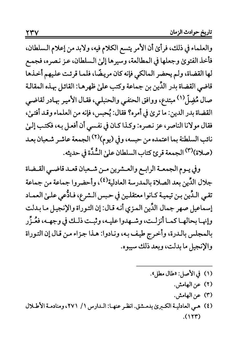 وفي يوم الجمعة الرابع والعشرين من شعبان قعد قاضي القضاة جلال الدِّين بعد الصلاة بالمدرسة العادلية (¬٤)، وأحضروا جماعة من جماعة تقي الدِّين بن تيمية كانوا معتقلين في حبس الشرع، فادُّعي على العماد إسماعيل صهر جمال الدِّين المزي أنه قال: إن التوراة والإنجيل ما بدلت وإنها بحالها كما أنزلت، وشهدوا عليه، وثبت ذلك في وجهه، فعُزِّر بالمجلس بالدرة، وأخرج طيف به، ونادوا: هذا جزاء من قال إن التوراة والإنجيل ما بدلت، وبعد ذلك سيبوه.