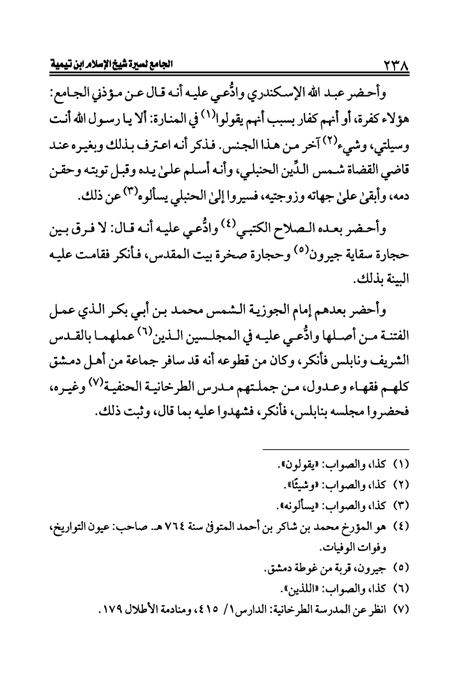 وأحضر بعدهم إمام الجوزية الشمس محمد بن أبي بكر الذي عمل الفتنة من أصلها وادُّعي عليه في المجلسين الذين (¬٦) عملهما بالقدس الشريف ونابلس فأنكر، وكان من قطوعه أنه قد سافر جماعة من أهل دمشق كلهم فقهاء وعدول، من جملتهم مدرس الطرخانية الحنفية (¬٧) وغيره، فحضروا مجلسه بنابلس، فأنكر، فشهدوا عليه بما قال، وثبت ذلك.