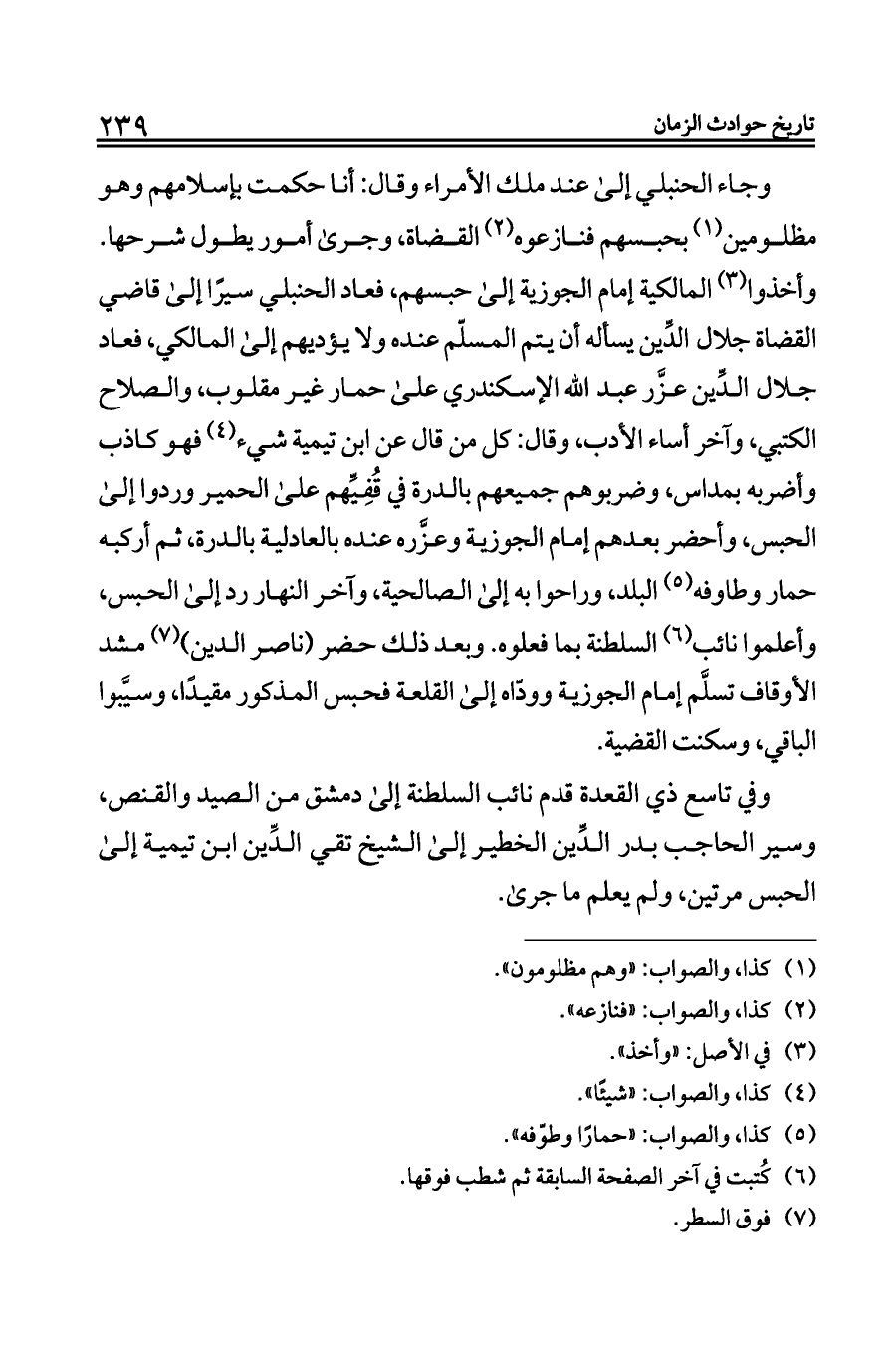 وجاء الحنبلي إلى عند ملك الأمراء وقال: أنا حكمت بإسلامهم وهو مظلومين (¬١) بحبسهم فنازعوه (¬٢) القضاة، وجرى أمور يطول شرحها. وأخذوا (¬٣) المالكية إمام الجوزية إلى حبسهم، فعاد الحنبلي سيرًا إلى قاضي القضاة جلال الدِّين يسأله أن يتم المسلّم عنده ولا يؤديهم إلى المالكي، فعاد جلال الدِّين عزَّر عبد الله الإسكندري على حمار غير مقلوب، والصلاح الكتبي، وآخر أساء الأدب، وقال: كل من قال عن ابن تيمية شيء (¬٤) فهو كاذب وأضربه بمداس، وضربوهم جميعهم بالدرة في قُفِيِّهم على الحمير وردوا إلى الحبس، وأحضر بعدهم إمام الجوزية وعزَّره عنده بالعادلية بالدرة، ثم أركبه حمار وطاوفه (¬٥) البلد، وراحوا به إلى الصالحية، وآخر النهار رد إلى الحبس، وأعلموا نائب (¬٦) السلطنة بما فعلوه. وبعد ذلك حضر (ناصر الدين) (¬٧) مشد الأوقاف تسلَّم إمام الجوزية وودّاه إلى القلعة فحبس المذكور مقيدًا، وسيَّبوا الباقي، وسكنت القضية.