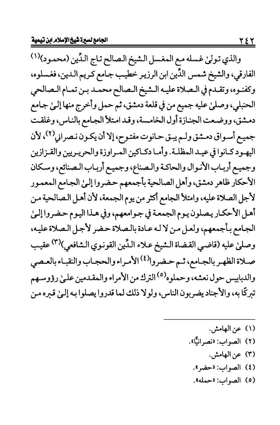 والذي تولى غسله مع المغسل الشيخ الصالح تاج الدِّين (محمود) (¬١) الفارقي، والشيخ شمس الدِّين ابن الرزير خطيب جامع كريم الدين، فغسلوه، وكفنوه، وتقدم في الصلاة عليه الشيخ الصالح محمد بن تمام الصالحي الحنبلي، وصلى عليه جميع من في قلعة دمشق، ثم حمل وأخرج منها إلى جامع دمشق، ووضعت الجنازة أول الخامسة، وقد امتلأ الجامع بالناس، وغلقت جميع أسواق دمشق ولم يبق حانوت مفتوح، إلا أن يكون نصراني (¬٢)، لأن اليهود كانوا في عيد المظلة.