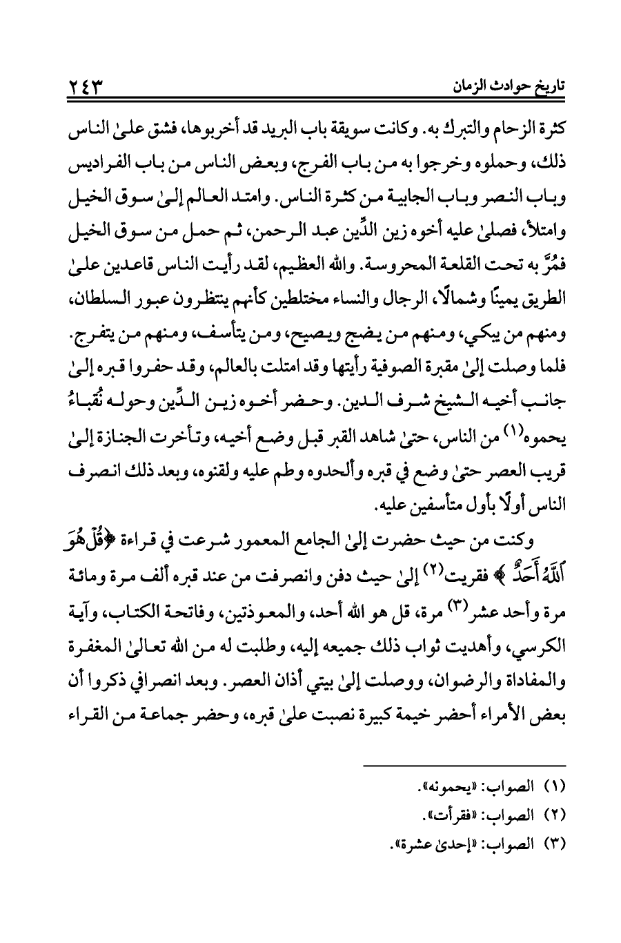 وكنت من حيث حضرت إلى الجامع المعمور شرعت في قراءة {قُلْ هُوَ اللَّهُ أَحَدٌ} فقريت (¬٢) إلى حيث دفن وانصرفت من عند قبره ألف مرة ومائة مرة وأحد عشر (¬٣) مرة، قل هو الله أحد، والمعوذتين، وفاتحة الكتاب، وآية الكرسي، وأهديت ثواب ذلك جميعه إليه، وطلبت له من الله تعالى المغفرة والمفاداة والرضوان، ووصلت إلى بيتي أذان العصر. وبعد انصرافي ذكروا أن بعض الأمراء أحضر خيمة كبيرة نصبت على قبره، وحضر جماعة من القراء