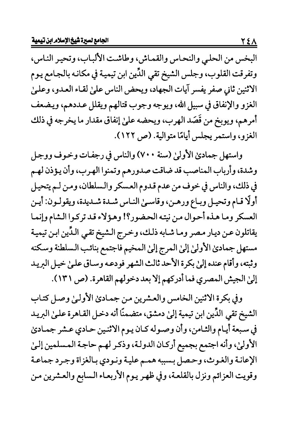 البخس من الحلي والنحاس والقماش، وطاشت الألباب، وتحير الناس، وتفرقت القلوب، وجلس الشيخ تقي الدِّين ابن تيمية في مكانه بالجامع يوم الاثنين ثاني صفر يفسر آيات الجهاد، ويحض الناس على لقاء العدو، وعلى الغزو والإنفاق في سبيل الله، ويوجه وجوب قتالهم ويقلل عددهم، ويضعف أمرهم، ويوبخ من قَصَد الهرب، ويحضه على إنفاق مقدار ما يخرجه في ذلك الغزو، واستمر يجلس أيامًا متوالية. (ص ١٢٢).