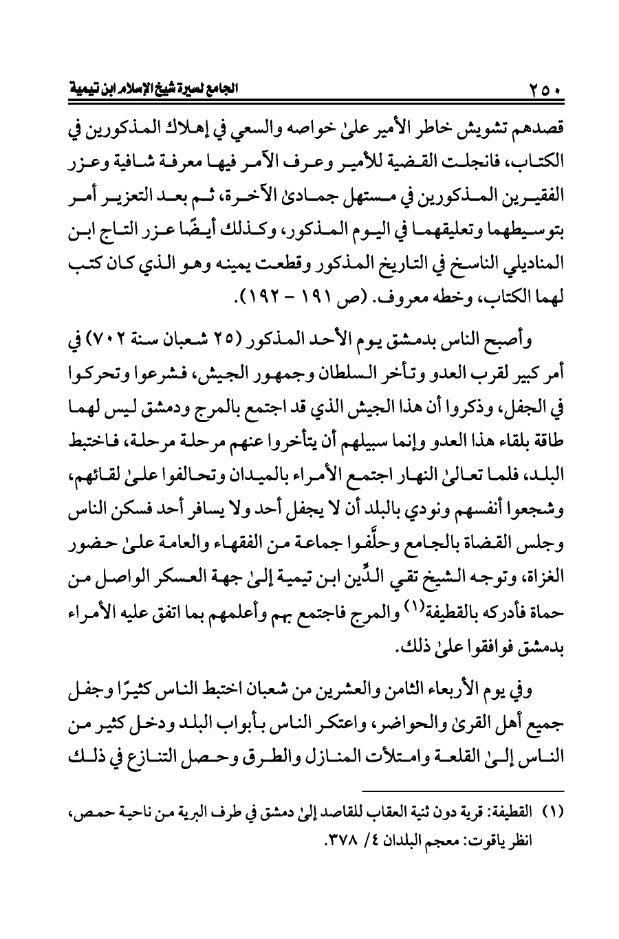 وأصبح الناس بدمشق يوم الأحد المذكور (٢٥ شعبان سنة ٧٠٢) في أمر كبير لقرب العدو وتأخر السلطان وجمهور الجيش، فشرعوا وتحركوا في الجفل، وذكروا أن هذا الجيش الذي قد اجتمع بالمرج ودمشق ليس لهما طاقة بلقاء هذا العدو وإنما سبيلهم أن يتأخروا عنهم مرحلة مرحلة، فاختبط البلد، فلما تعالى النهار اجتمع الأمراء بالميدان وتحالفوا على لقائهم، وشجعوا أنفسهم ونودي بالبلد أن لا يجفل أحد ولا يسافر أحد فسكن الناس وجلس القضاة بالجامع وحلَّفوا جماعة من الفقهاء والعامة على حضور الغزاة، وتوجه الشيخ تقي الدِّين ابن تيمية إلى جهة العسكر الواصل من حماة فأدركه بالقطيفة (¬١) والمرج فاجتمع بهم وأعلمهم بما اتفق عليه الأمراء بدمشق فوافقوا على ذلك.