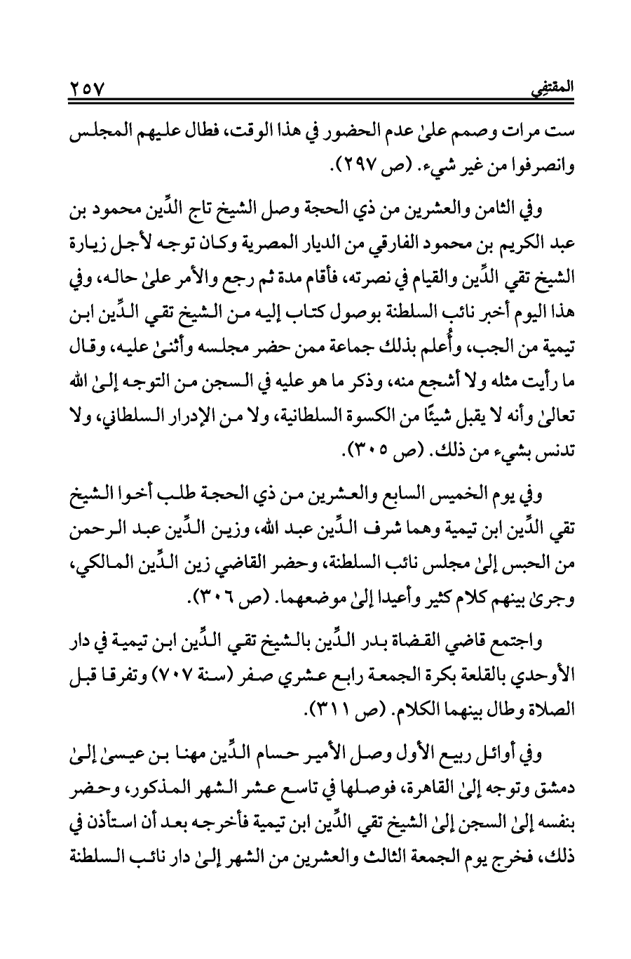 وفي يوم الخميس السابع والعشرين من ذي الحجة طلب أخوا الشيخ تقي الدِّين ابن تيمية وهما شرف الدِّين عبد الله، وزين الدِّين عبد الرحمن من الحبس إلى مجلس نائب السلطنة، وحضر القاضي زين الدِّين المالكي، وجرى بينهم كلام كثير وأعيدا إلى موضعهما. (ص ٣٠٦).