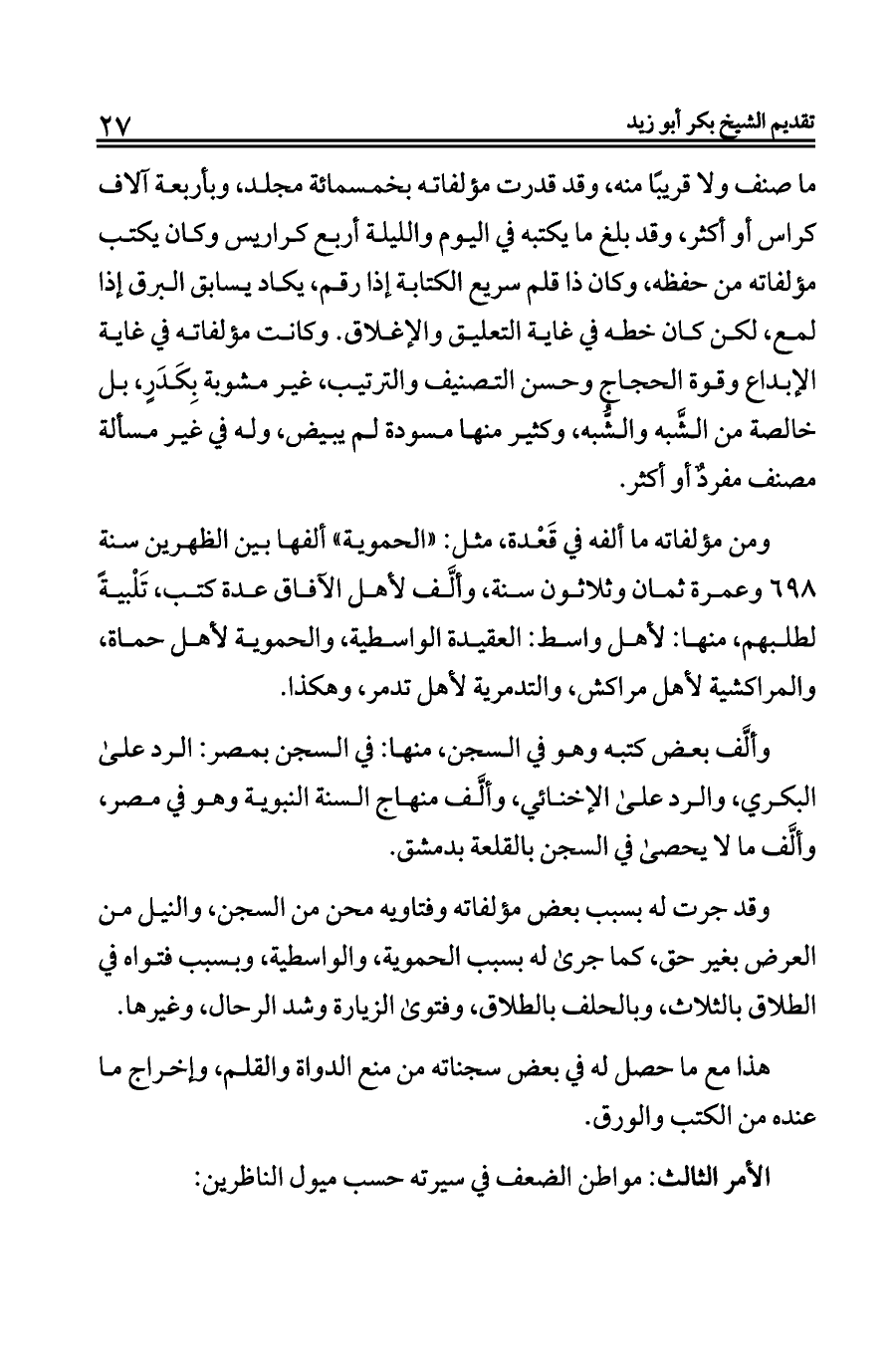 ومن مؤلفاته ما ألفه في قَعْدة، مثل: «الحموية» ألفها بين الظهرين سنة ٦٩٨ وعمرة ثمان وثلاثون سنة، وألَّف لأهل الآفاق عدة كتب، تَلْبيةً لطلبهم، منها: لأهل واسط: العقيدة الواسطية، والحموية لأهل حماة، والمراكشية لأهل مراكش، والتدمرية لأهل تدمر، وهكذا.