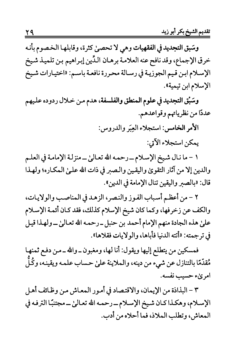 ١ - ما نال شيخ الإسلام ــ رحمه الله تعالى ــ منزلة الإمامة في العلم والدين إلا من آثار التقوى واليقين والصبر في ذات الله على المكاره؛ ولهذا قال: «بالصبر واليقين تنال الإمامة في الدين».