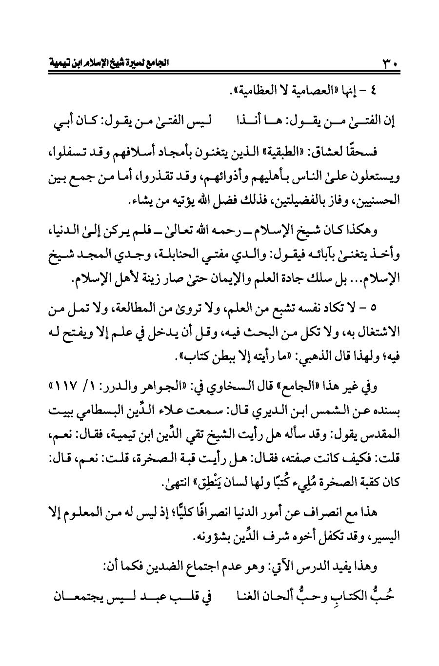 وفي غير هذا «الجامع» قال السخاوي في: «الجواهر والدرر: ١/ ١١٧» بسنده عن الشمس ابن الديري قال: سمعت علاء الدِّين البسطامي ببيت المقدس يقول: وقد سأله هل رأيت الشيخ تقي الدِّين ابن تيمية، فقال: نعم، قلت: فكيف كانت صفته، فقال: هل رأيت قبة الصخرة، قلت: نعم، قال: كان كقبة الصخرة مُلِيء كُتبًا ولها لسان يَنْطِق» انتهى.