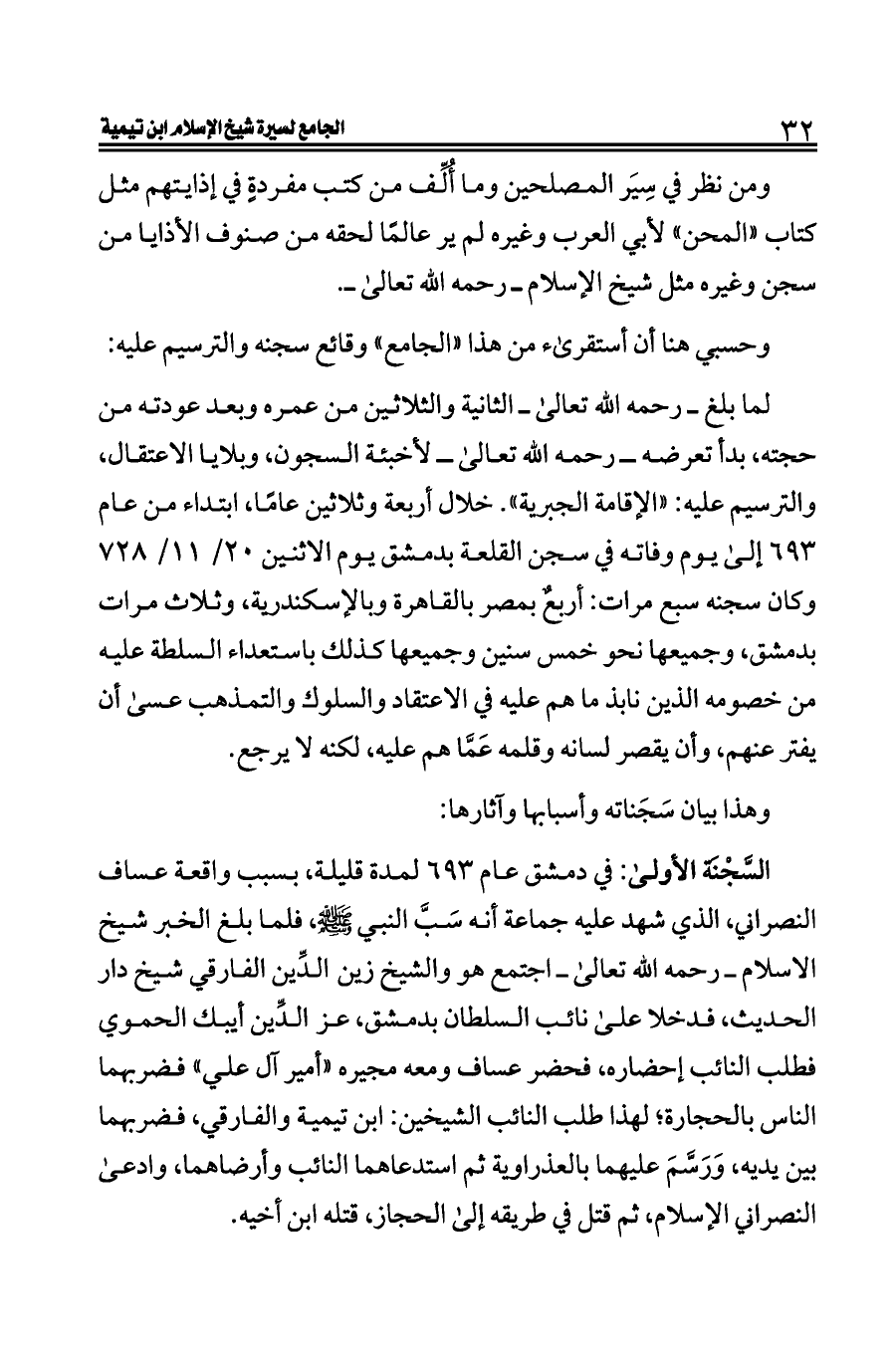 ومن نظر في سِيَر المصلحين وما أُلِّف من كتب مفردةٍ في إذايتهم مثل كتاب «المحن» لأبي العرب وغيره لم ير عالمًا لحقه من صنوف الأذايا من سجن وغيره مثل شيخ الإسلام ــ رحمه الله تعالى ــ.