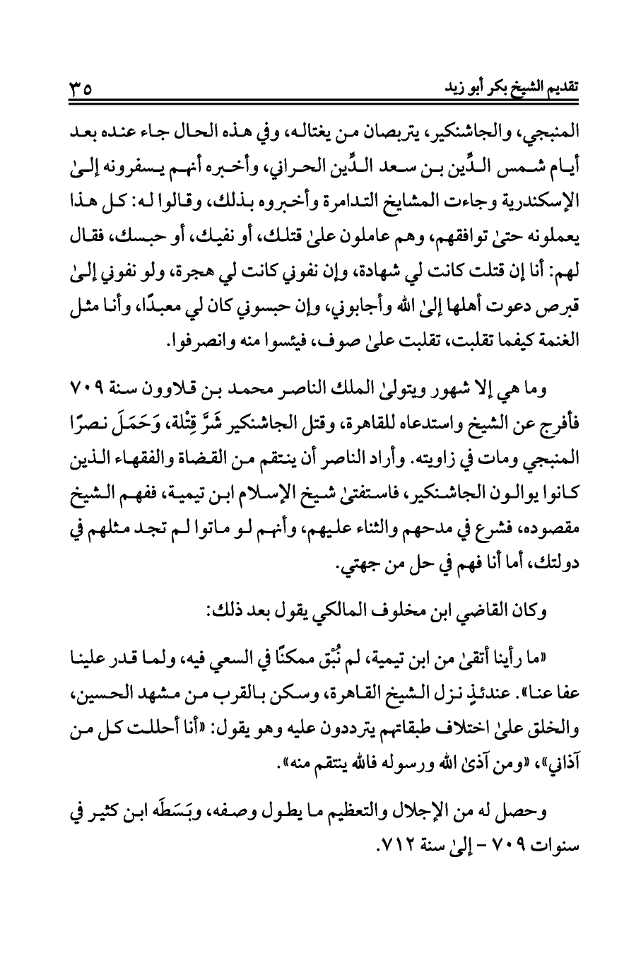 المنبجي، والجاشنكير، يتربصان من يغتاله، وفي هذه الحال جاء عنده بعد أيام شمس الدِّين بن سعد الدِّين الحراني، وأخبره أنهم يسفرونه إلى الإسكندرية وجاءت المشايخ التدامرة وأخبروه بذلك، وقالوا له: كل هذا يعملونه حتى توافقهم، وهم عاملون على قتلك، أو نفيك، أو حبسك، فقال لهم: أنا إن قتلت كانت لي شهادة، وإن نفوني كانت لي هجرة، ولو نفوني إلى قبرص دعوت أهلها إلى الله وأجابوني، وإن حبسوني كان لي معبدًا، وأنا مثل الغنمة كيفما تقلبت، تقلبت على صوف، فيئسوا منه وانصرفوا.
