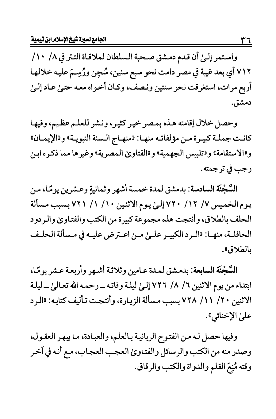 السَّجْنَة السادسة: بدمشق لمدة خمسة أشهر وثمانيةٍ وعشرين يومًا، من يوم الخميس ٧/ ١٢/ ٧٢٠ إلى يوم الاثنين ١٠/ ١/ ٧٢١ بسبب مسألة الحلف بالطلاق، وأنتجت هذه مجموعة كبيرة من الكتب والفتاوى والردود الحافلة، منها: «الرد الكبير على من اعترض عليه في مسألة الحلف بالطلاق».