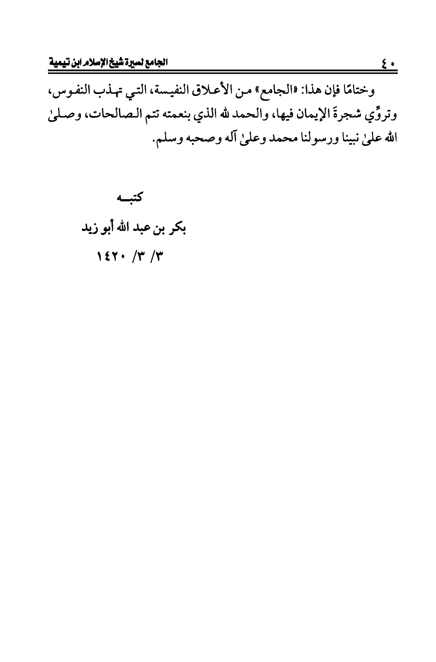 وختامًا فإن هذا: «الجامع» من الأعلاق النفيسة، التي تهذب النفوس، وتروِّي شجرةَ الإيمان فيها، والحمد لله الذي بنعمته تتم الصالحات، وصلى الله على نبينا ورسولنا محمد وعلى آله وصحبه وسلم.