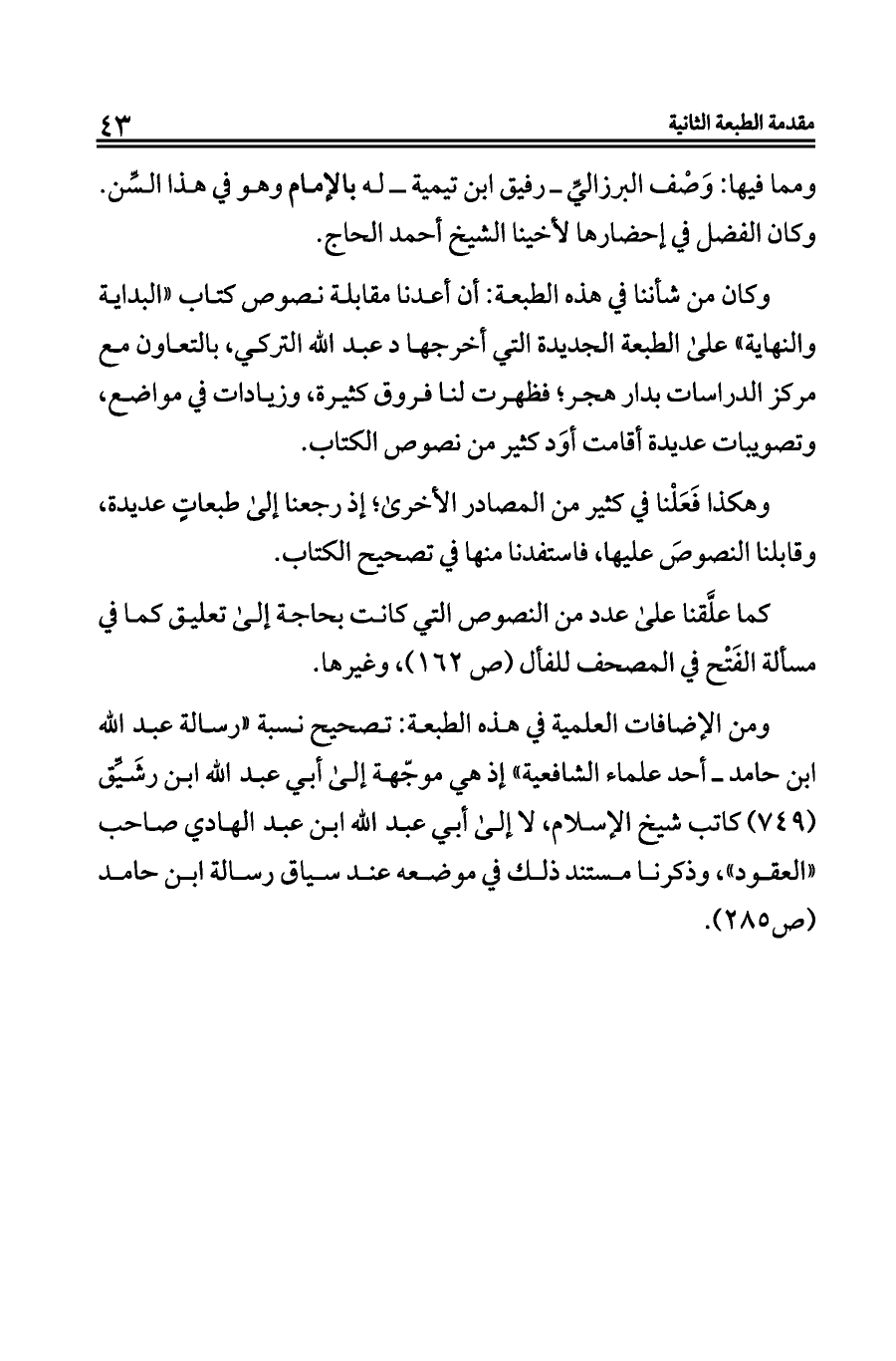 وكان من شأننا في هذه الطبعة: أن أعدنا مقابلة نصوص كتاب «البداية والنهاية» على الطبعة الجديدة التي أخرجها د عبد الله التركي، بالتعاون مع مركز الدراسات بدار هجر؛ فظهرت لنا فروق كثيرة، وزيادات في مواضع، وتصويبات عديدة أقامت أوَد كثير من نصوص الكتاب.
